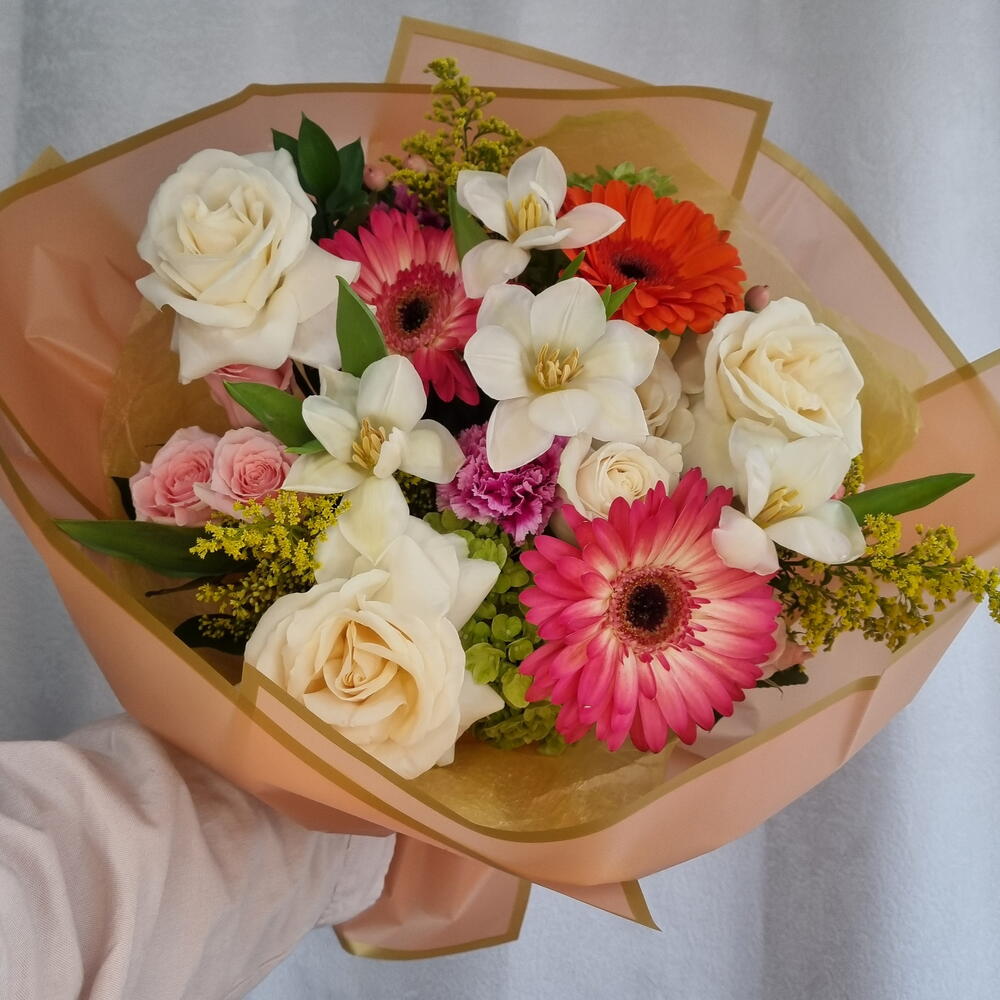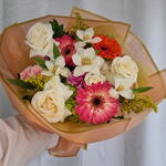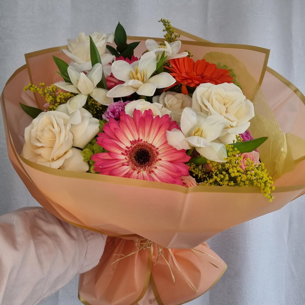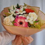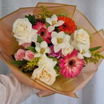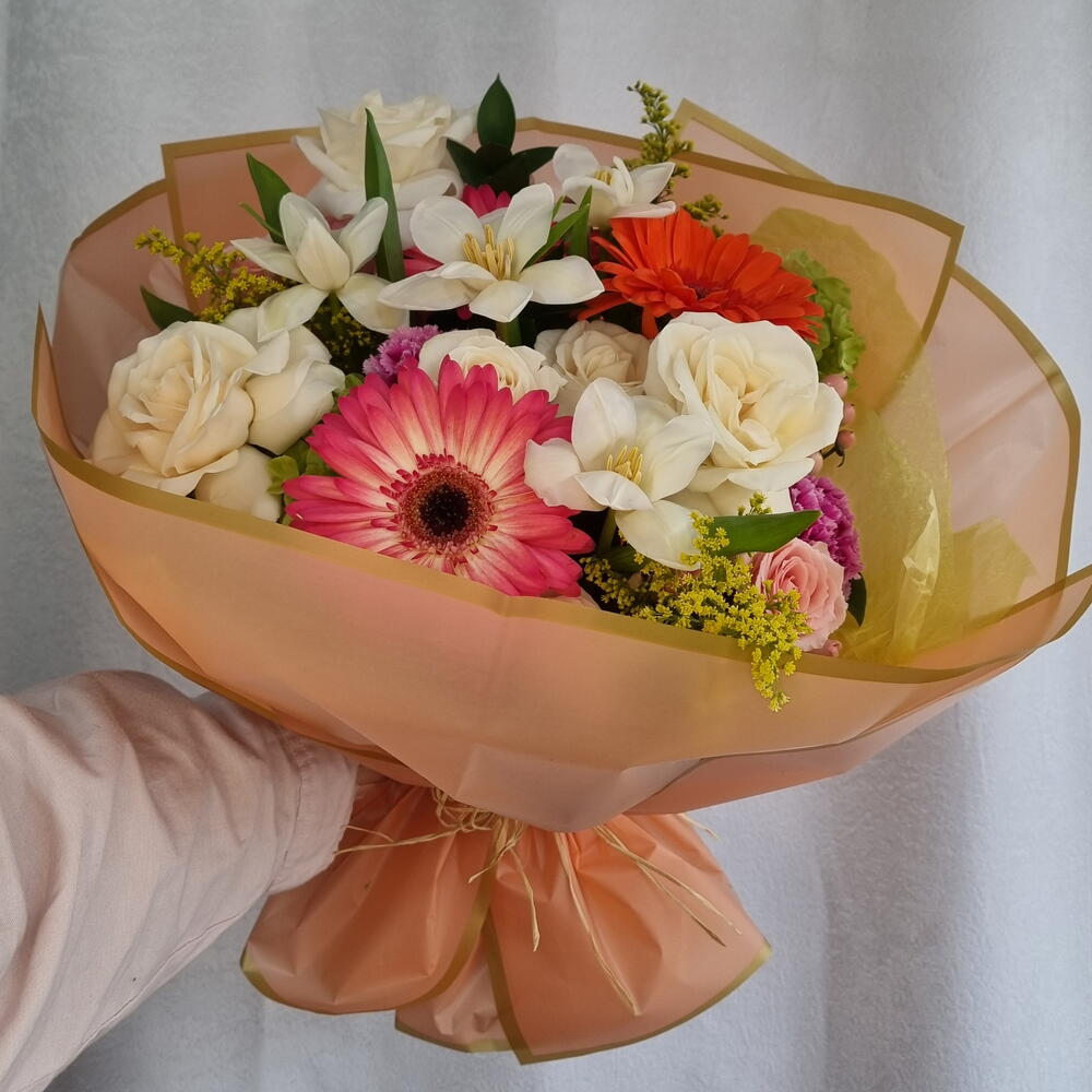 Весёлый и яркий букет, сочетающий элегантные белые розы, яркие герберы, нежные кустовые розы, сезонные цветы и свежую зелень. Эта композиция полна красок и жизни, создавая радостное и воодушевляющее настроение. Идеально подходит для дней рождения, подарков в знак благодарности, праздников или просто чтобы поднять кому-то настроение.