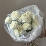 A mono bouquet of ranunculuses, white ranunculuses wrapped in tissue paper.