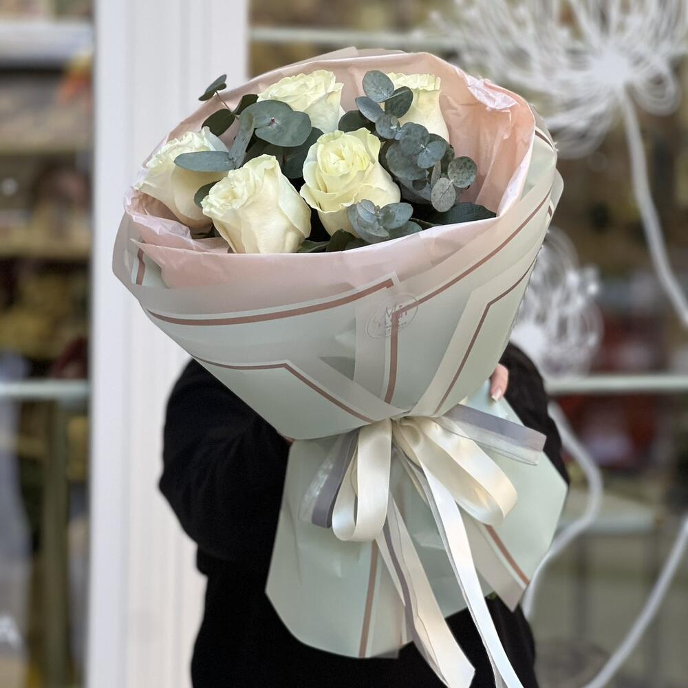 Эвкалипт - 3 шт. Лента атласная - 2 шт. Тишью - 3 шт. белая роза - 5 шт. Корейская упаковка - 3 шт.
