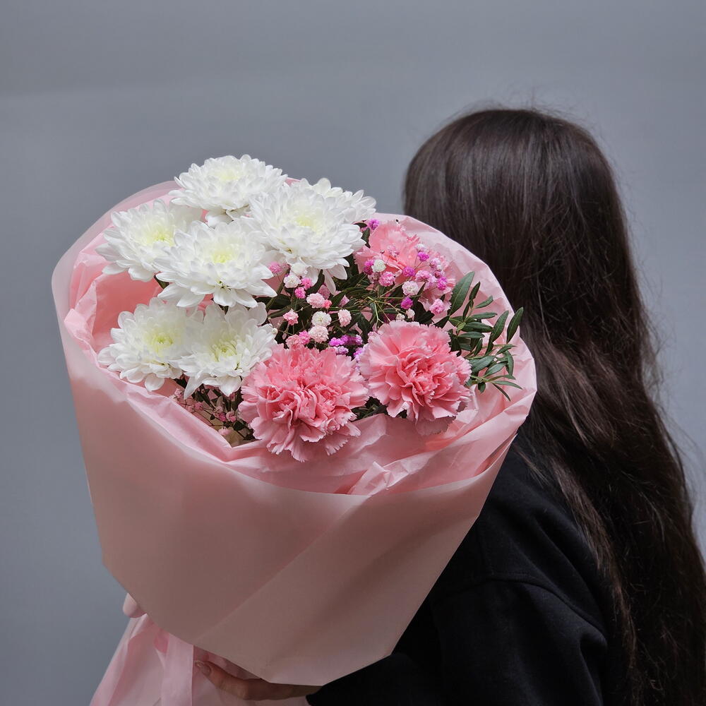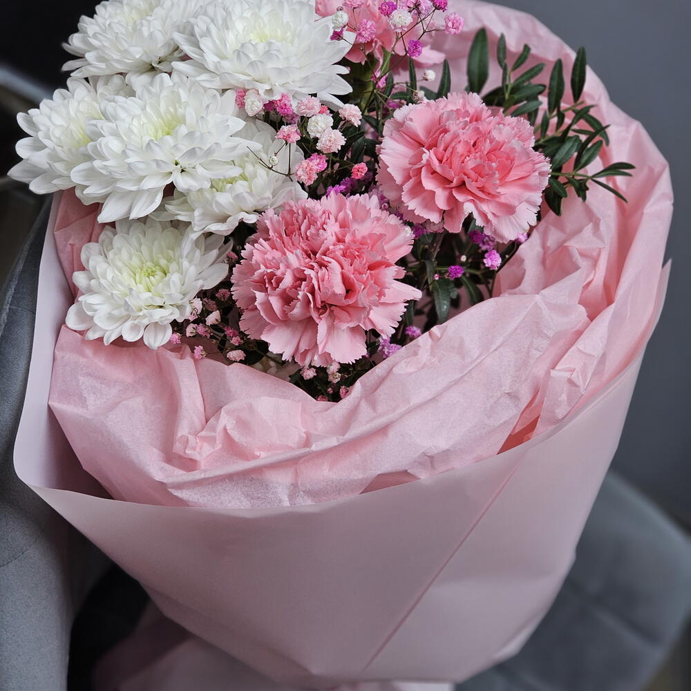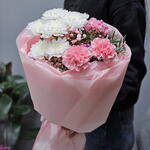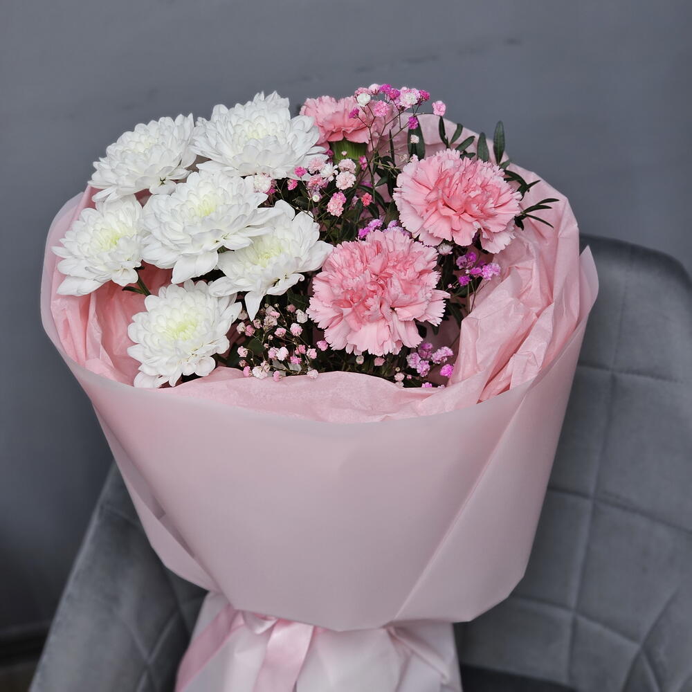 Гипсофила - 1 шт. Хризантема кустовая - 1 шт. Диантус - 3 шт. Упаковка дизайнерская - 1 шт.
