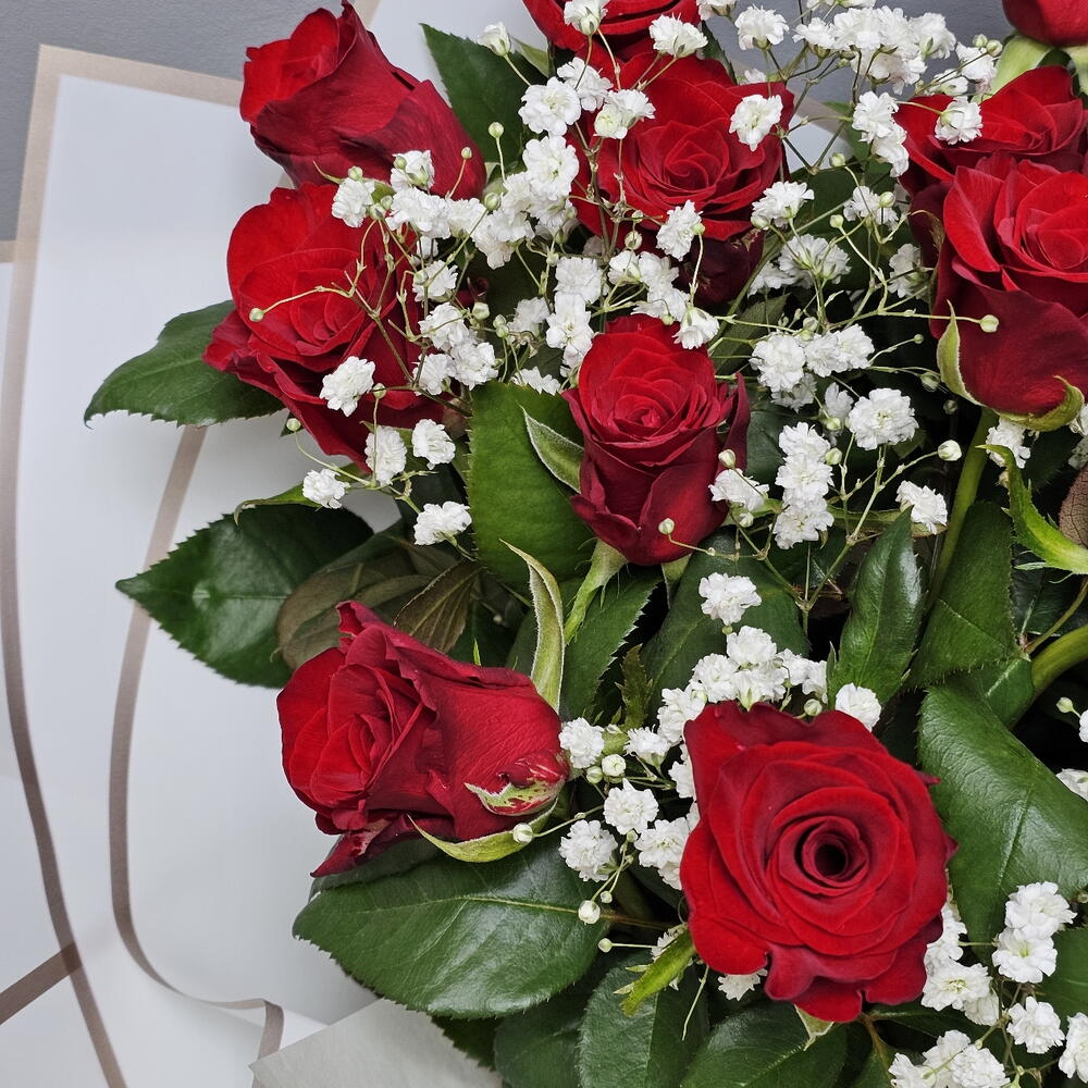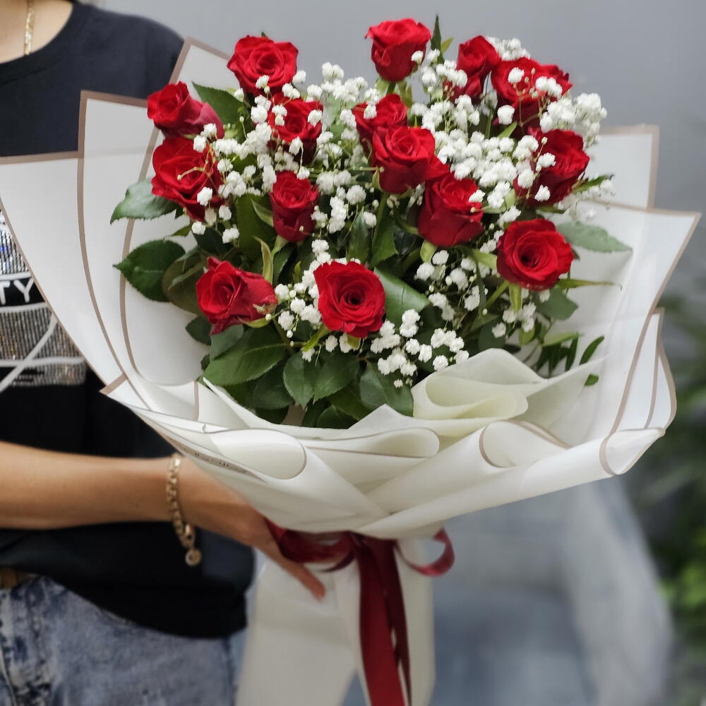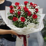 Гипсофила - 2 шт. Роза 50 см - 15 шт. Упаковка дизайнерская - 1 шт.