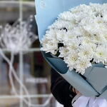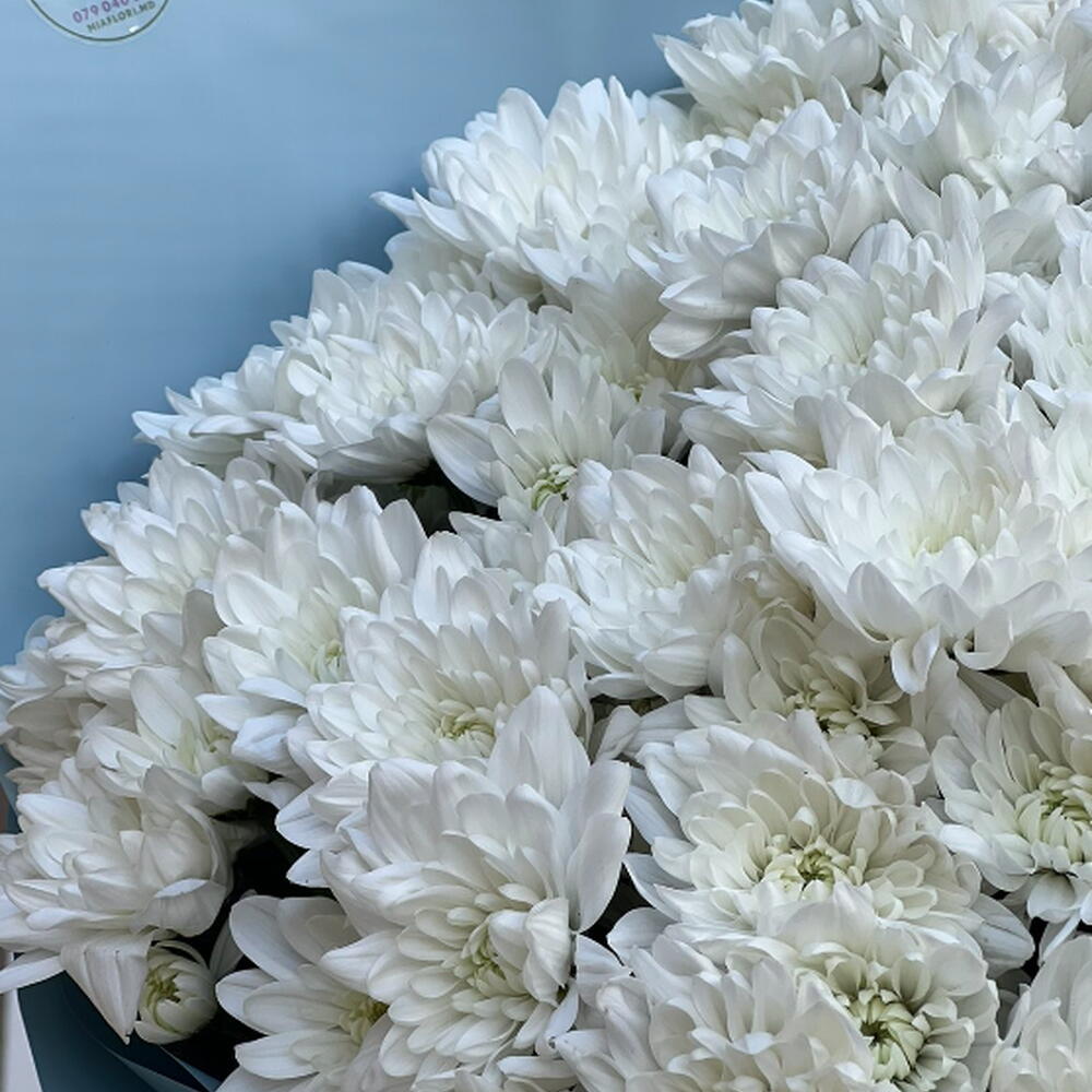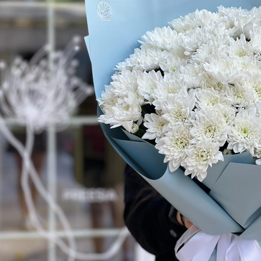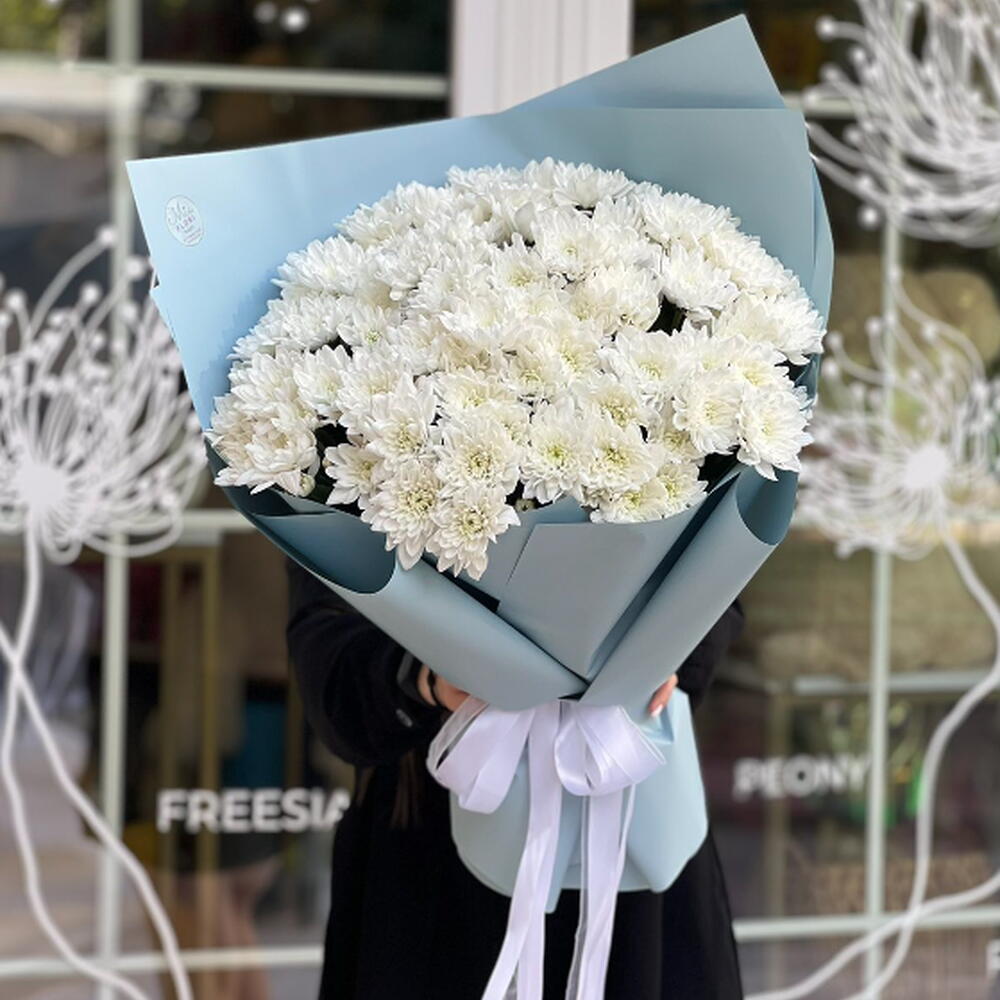 Атласная лента - 2 шт. Хризантема балтика белая - 15 шт. Корейская упаковка - 4 шт.
