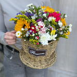 Solidago - 5 шт. Basket - 1 шт. Sunflower - 3 шт. cornations - 5 шт. camomile - 5 шт. Oasis Классик Кирпич 35 23X11X8Cm - 1 шт.