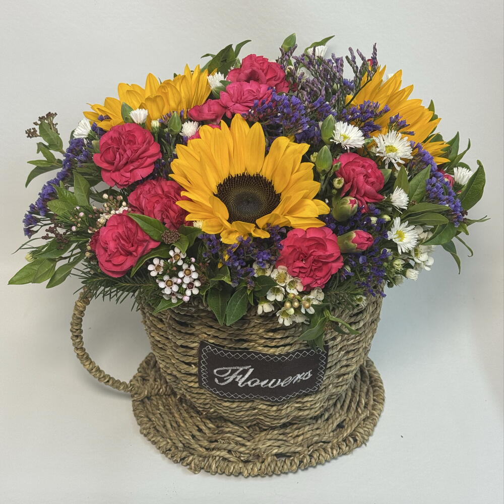 Solidago - 5 шт. Basket - 1 шт. Sunflower - 3 шт. cornations - 5 шт. camomile - 5 шт. Oasis Классик Кирпич 35 23X11X8Cm - 1 шт.