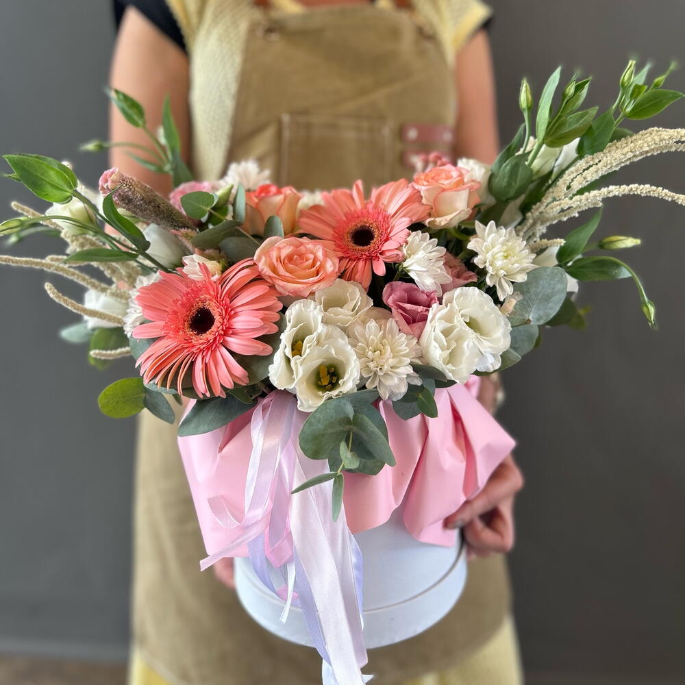 Alstroemeria - 4 шт. Gerbera - 5 шт. chrysanthemum bush - 3 шт. rose - 3 шт. hat box - 1 шт. ornamental greens - 7 шт. eustorma - 5 шт.