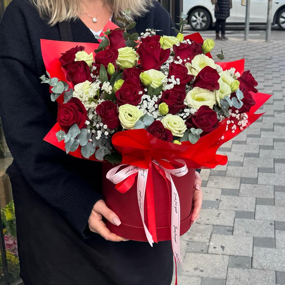 rose - 11 шт. lisianthus alice white - 11 шт. hatbox with ribbons - 1 шт.