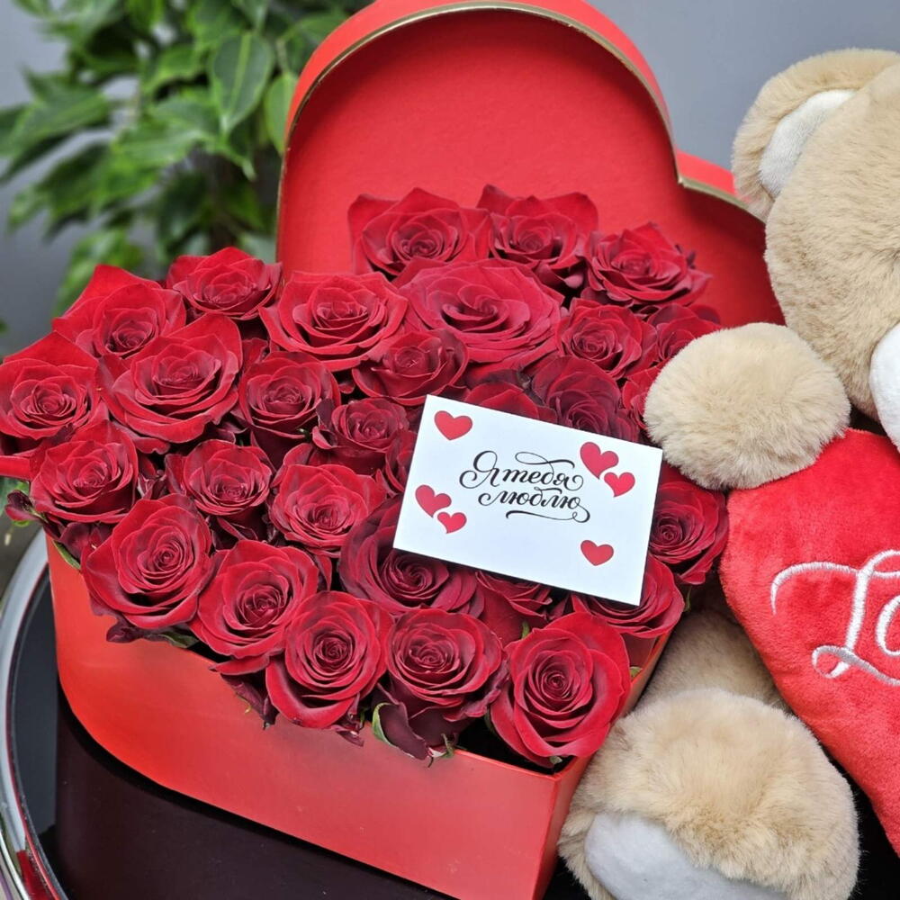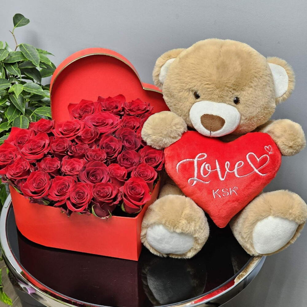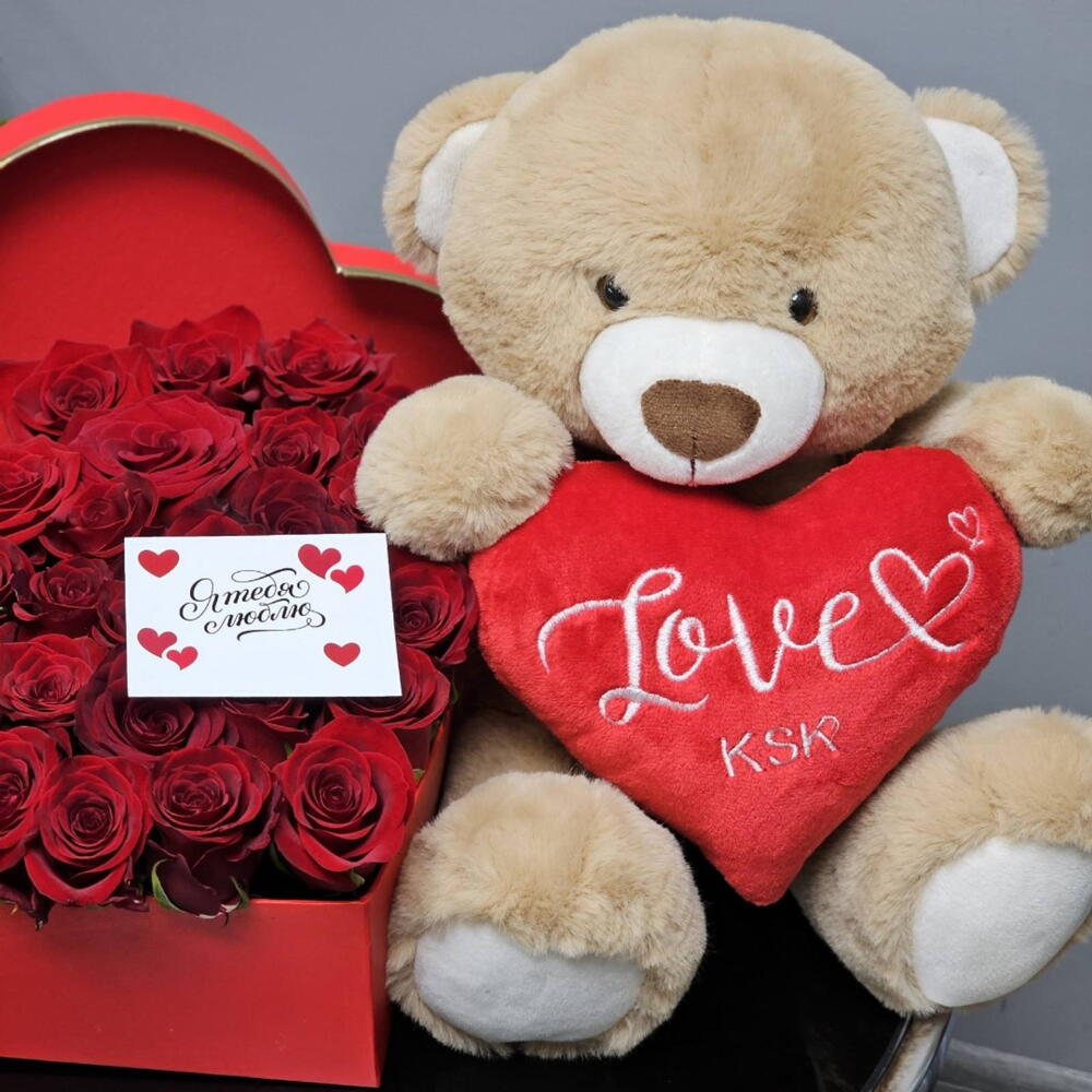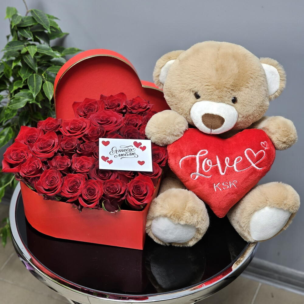 Роза - 31 шт. Флористическая губка - 2 шт. коробка сердце 25х28см - 1 шт. медвежонок 30см - 1 шт.