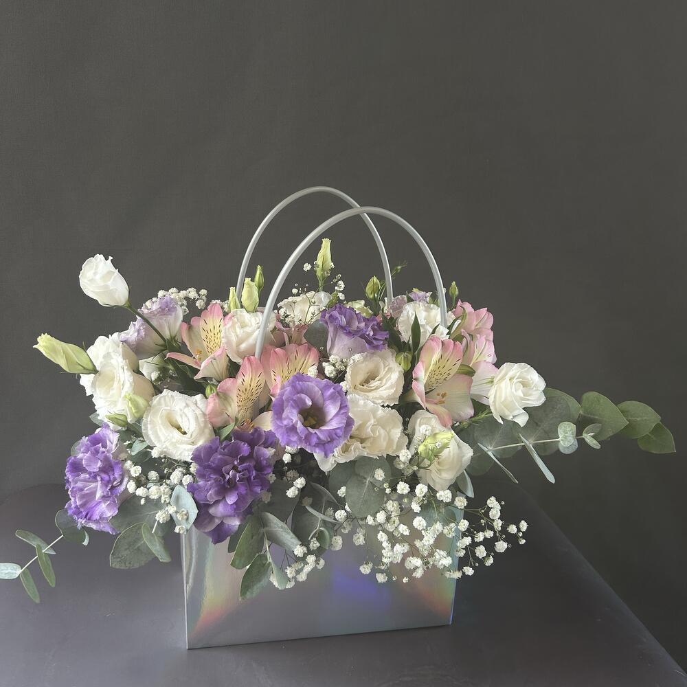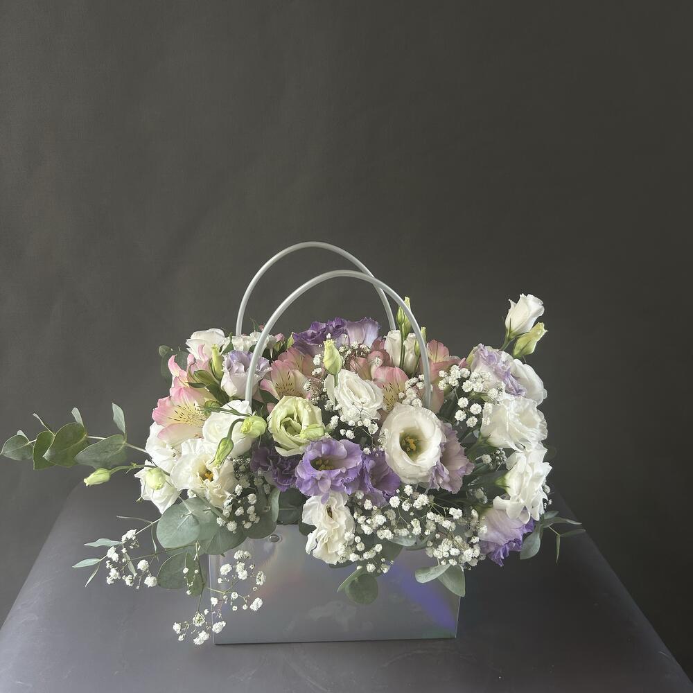 Alstroemeria - 3 шт. Gypsophila - 3 шт. Lisianthus - 7 шт. decorative greenery - 5 шт.