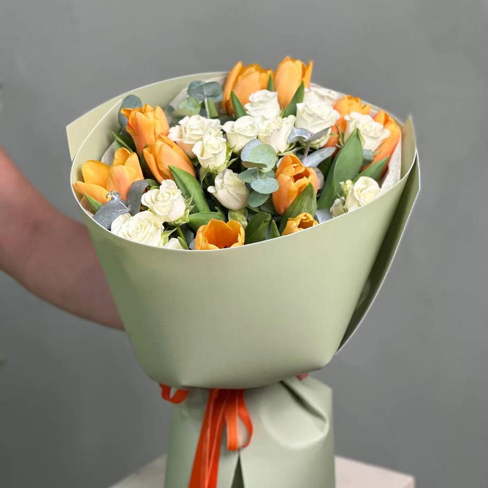 Eucalyptus - 1 шт. Tulips - 10 шт. Wrapping - 1 шт. букет роз в брызгах - 5 шт.