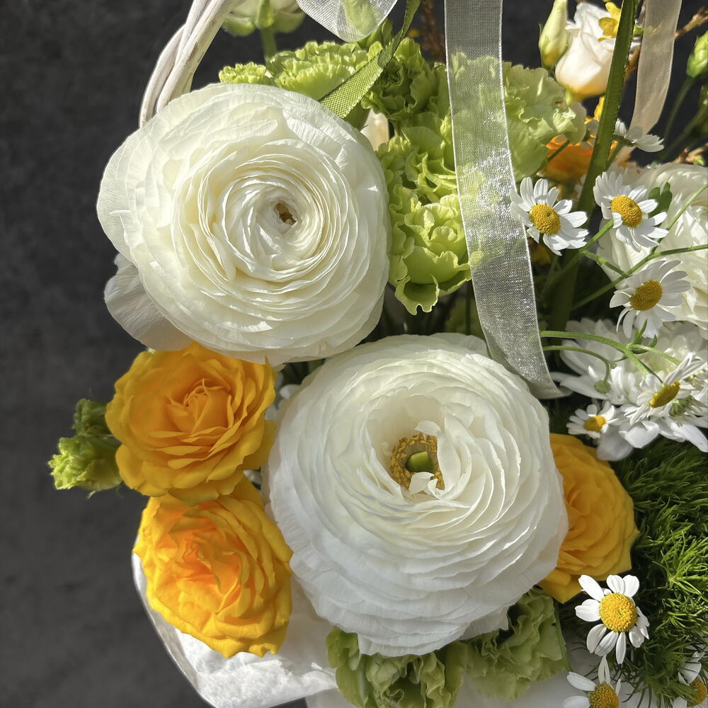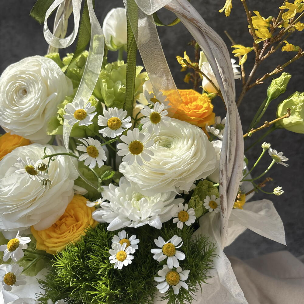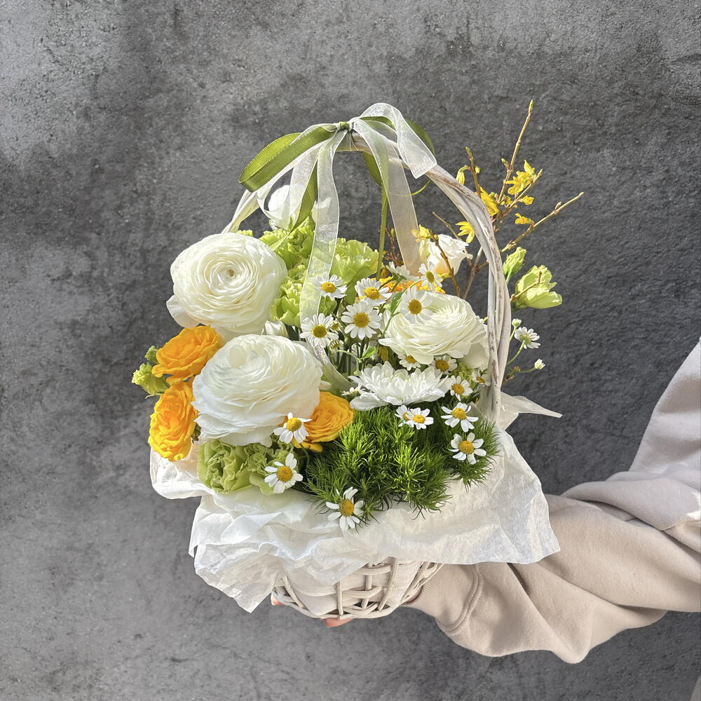Ribbon - 2 шт. Basket - 1 шт. Oasis - 1 шт. packaging - 1 шт. dianthus - 3 шт. ranunculus - 1 шт. tanacetum - 1 шт. rose spray - 1 шт.