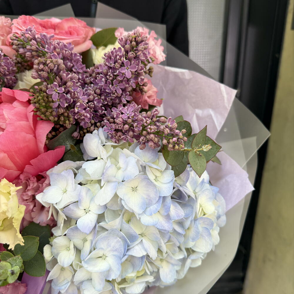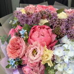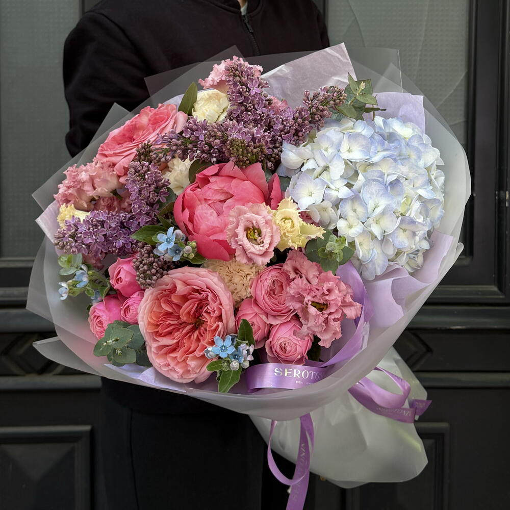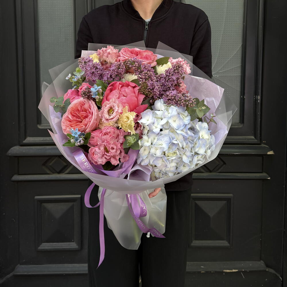 Эустома - 3 шт. hortensia - 1 шт. Lilac - 2 шт. dianthus - 3 шт. rose ecuador - 2 шт. paeonia - 1 шт. roses peony spray - 2 шт.