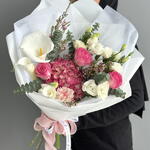 wax flower purple - 2 шт. rose pink candy - 3 шт. eustoma white standar - 3 шт. eucalyptus xl - 6 шт. calaleli - 3 шт. hydrangea fanta - 1 шт. diantus yukari - 1 шт.
