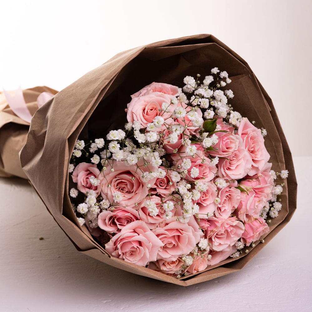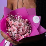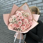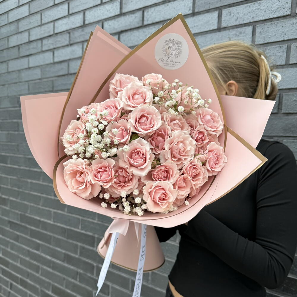 Букет "Цветочная Фантазия" (10 розовых кустовых роз, 5 веточек гипсофилы)