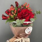 Ribbon - 1 шт. Eucalyptus - 1 шт. Alstroemeria - 2 шт. Oasis - 1 шт. paper - 1 шт. hypericum - 2 шт. Prantsuse rose - 1 шт.