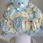 Experience the enchantment of the Flowers in a Box collection with this splendid assortment. Uniquely designed, it includes 11 precious Lisianthus, offering a sight of simple elegance. The addition of 20 radiant roses and 25 baby roses sublimely contrast the 6 pieces of soft blue hydrangea, causing a visually striking experience. To complete this beautiful spectacle, a single blue teddy bear nestles within the flowers - a delightful surprise that adds a warm, welcoming touch. This timeless flower arrangement makes a perfect gift for a loved one or a visual treat for your own home.