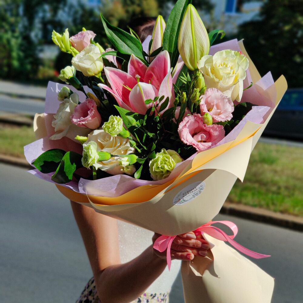 Eustoma - 2 шт. Lily - 1 шт. Pistacia - 1 шт. Ruskus - 1 шт. rose - 3 шт. dianthus - 2 шт.