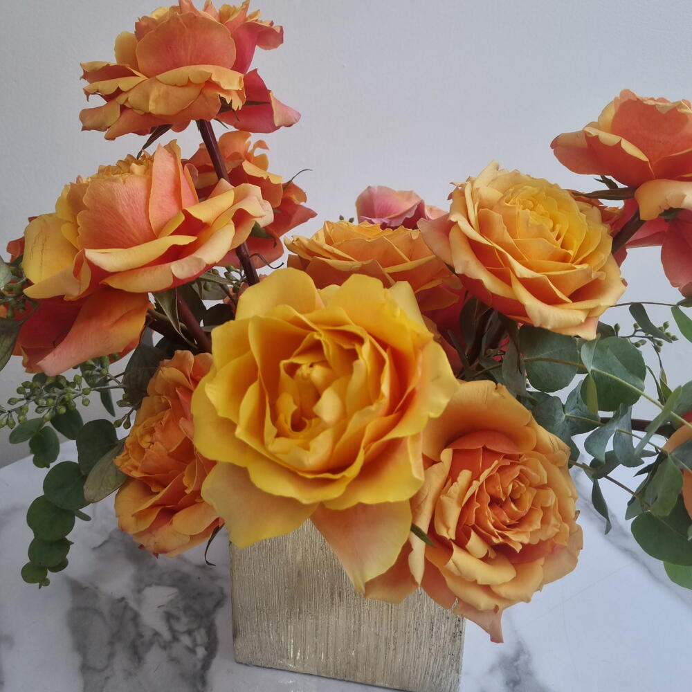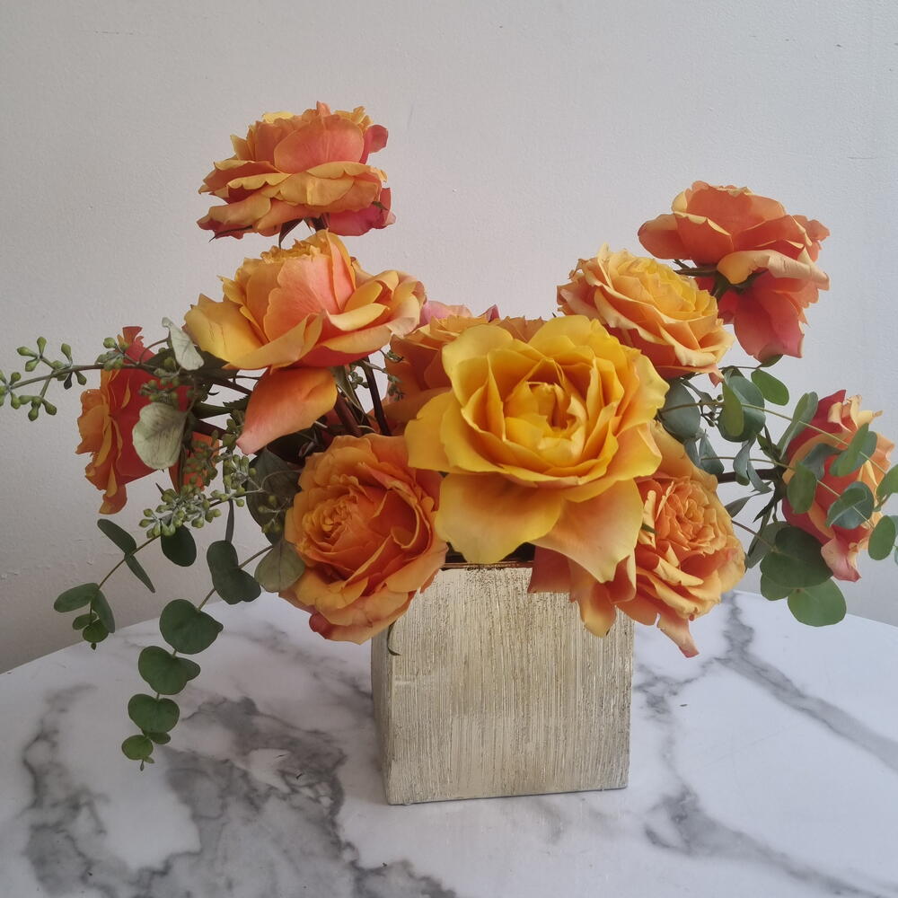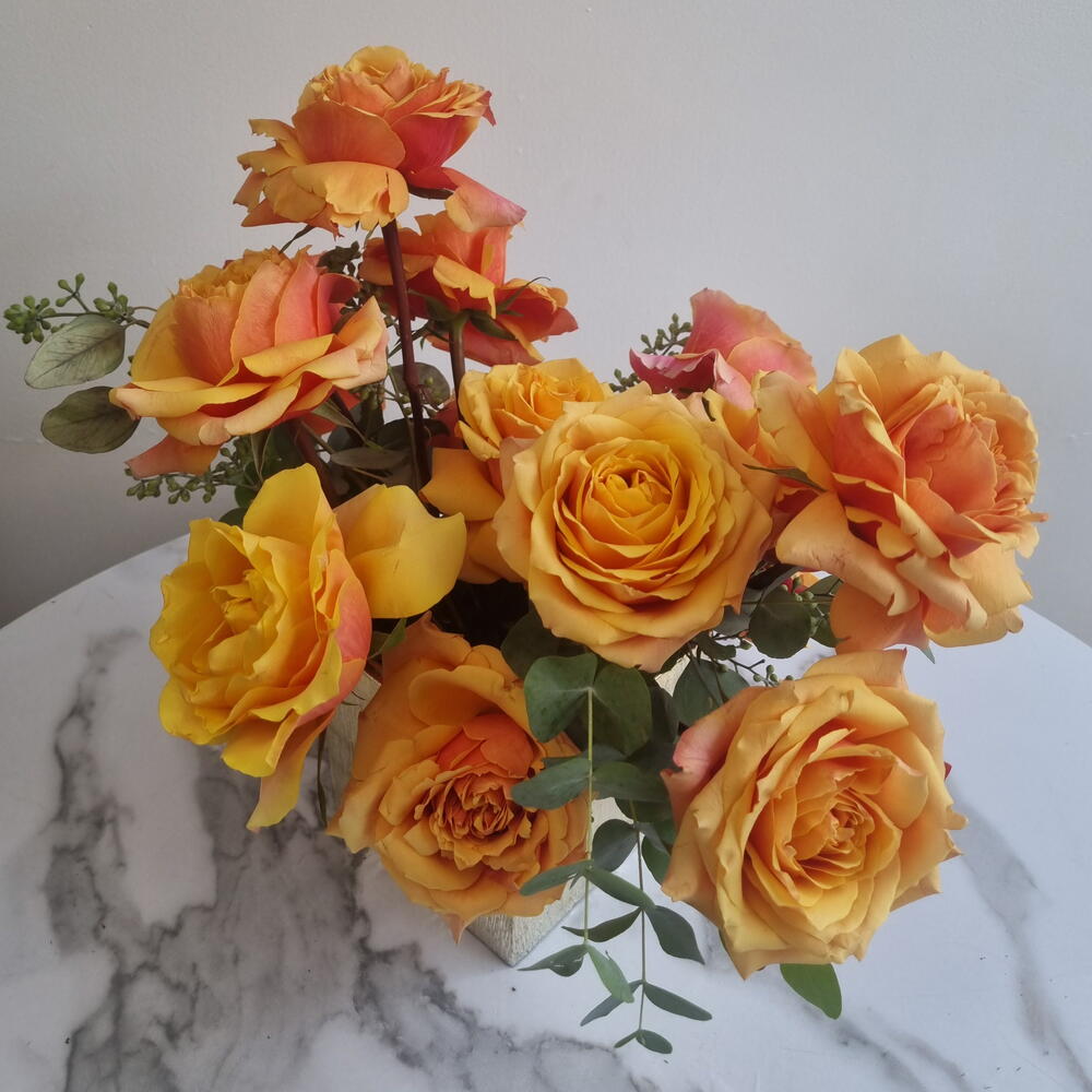 Golden Ember — это яркая дизайнерская цветочная композиция, выполненная в современном керамическом контейнере. В ней использованы премиальные розы золотистых и закатных оттенков, дополненные свежей зеленью; эта композиция излучает теплоту, энергию и смелую элегантность. Идеально подходит для дней рождения, поздравлений, торжеств или в качестве эффектного интерьерного акцента. Виды цветов и оттенки могут незначительно варьироваться в зависимости от сезонной доступности, сохраняя общую цветовую палитру и стиль.