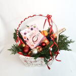 christmas ornaments - 5 шт. chocolate truffles - 1 шт. fresh evergreen branches - 10 шт. christmas gift basket - 1 шт. a bottle of sparkling wine or champagne - 1 шт. a box of gourmet chocolates - “chocolate truffle collection” - 1 шт. fresh apple - 2 шт. fresh mandarin - 3 шт.