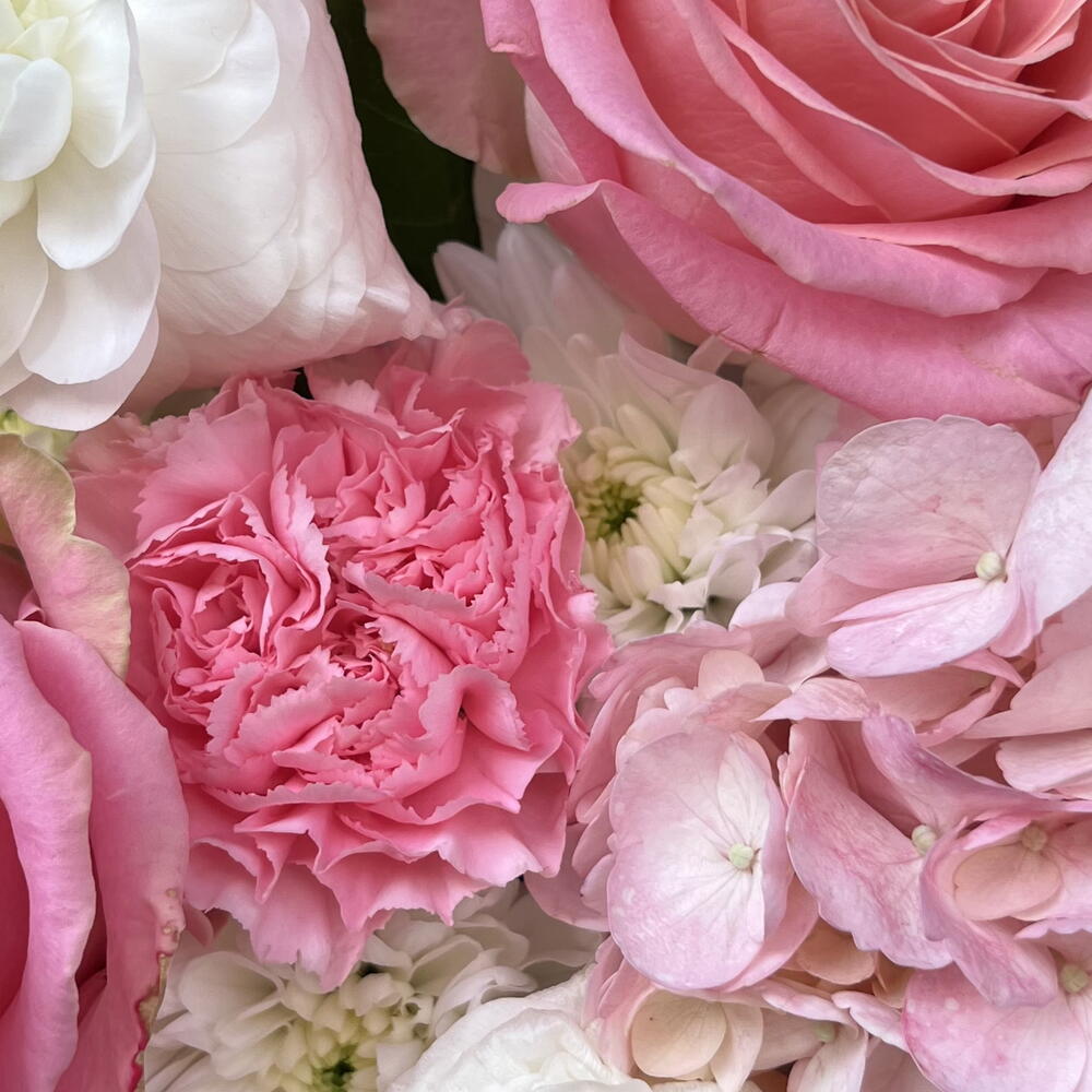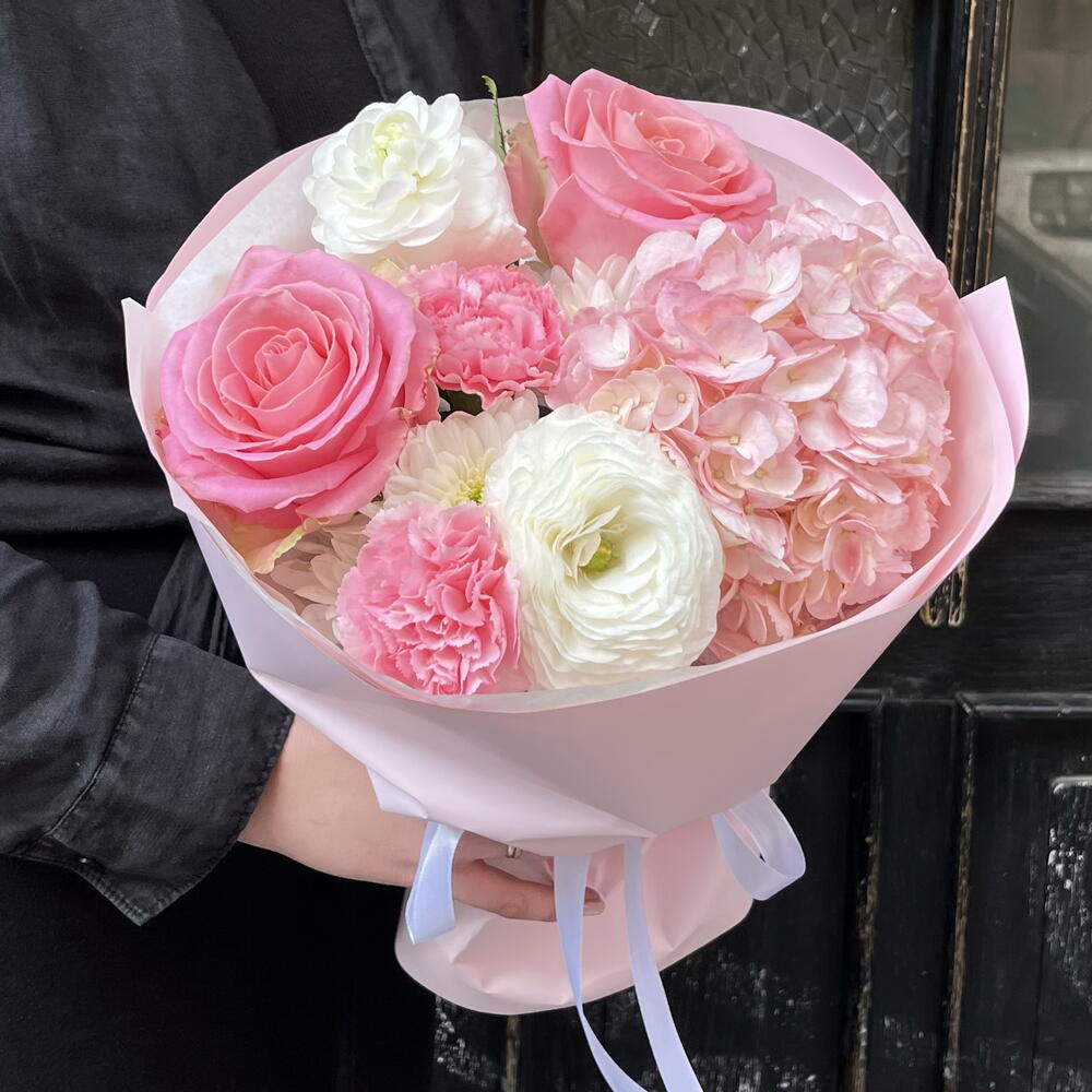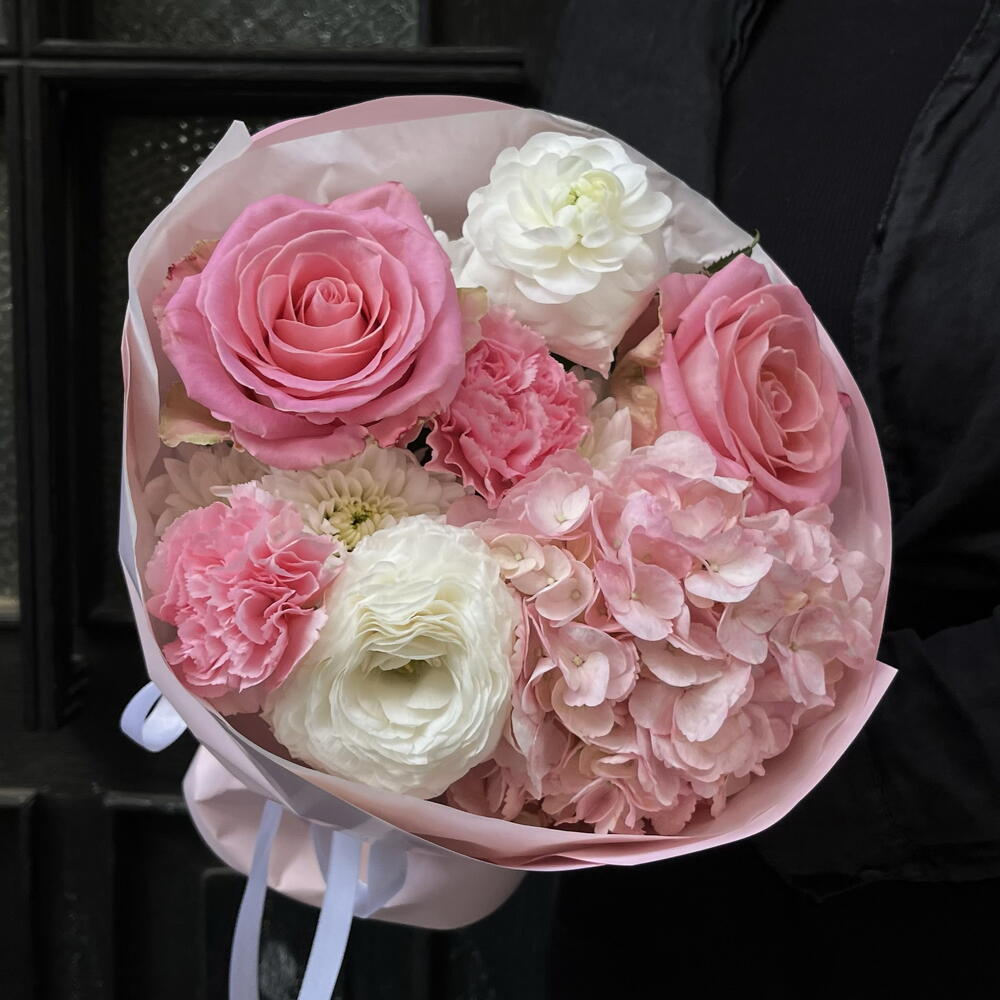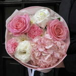 hortensia - 1 шт. dianthus - 2 шт. ranunculus - 2 шт. designer wrapping - 1 шт. ecuadorian roses - 2 шт. hrizantema white - 1 шт.