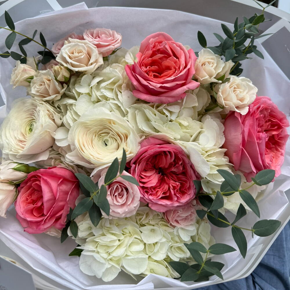 ranunculus - 2 шт. eucalyptus parvifolia - 5 шт. белые гортензии - 3 шт. розовая роза садового сорта "Экспрессия" - 4 шт. розовые спрей-розы - 3 шт. белые спрей-розы - 2 шт.