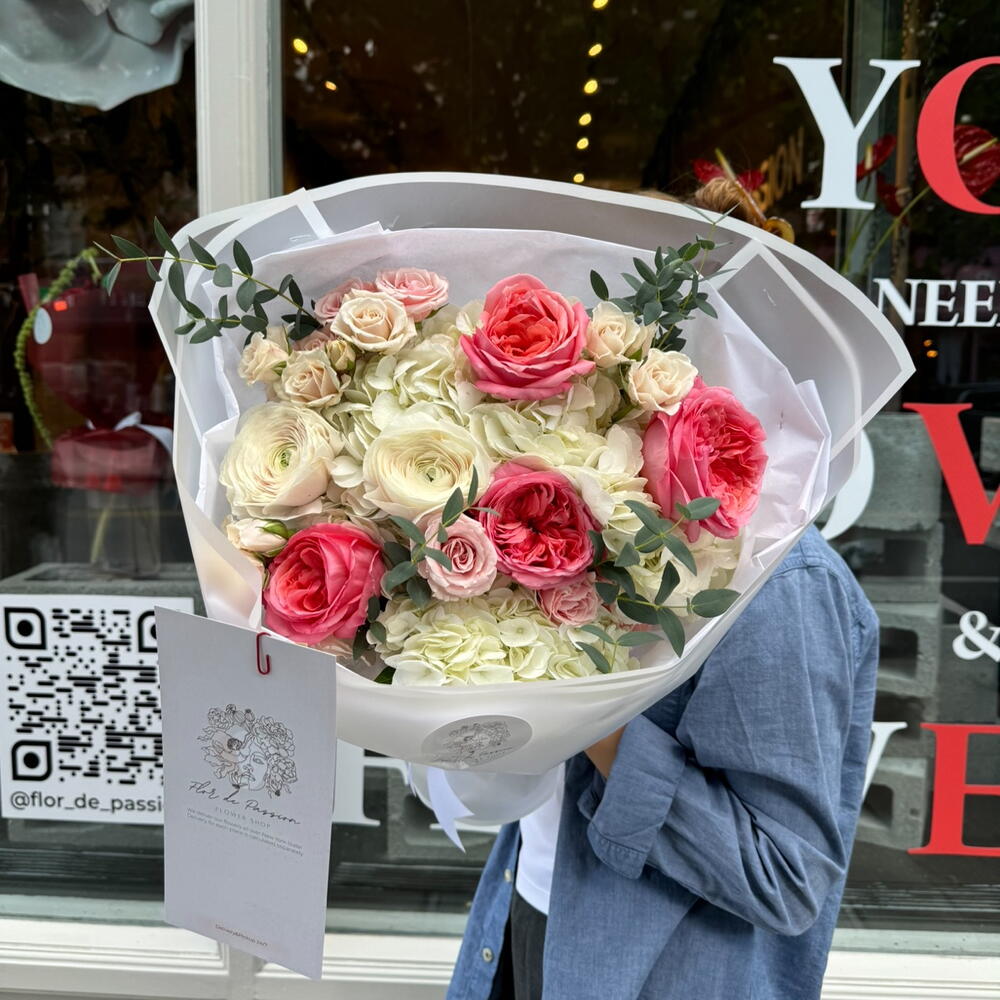 Букет-объятие (ранункулюсы, садовые розы, гортензии, бутонные розы, эвкалипт)