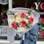 Букет красивый получился. Доставили немного позже назначенного времени, не критично для нас это было. Фото отчет сделали быстро. Доставка считаю дорогая, плюс большие розы не первой свежести были.