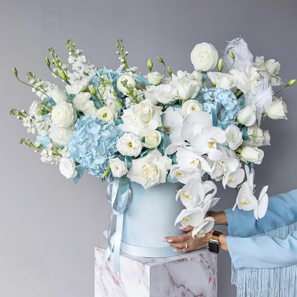 Гортензия - 5 шт. Дельфиниум - 15 шт. Ранункулюс - 10 шт. орхидея - 2 шт. розы - 25 шт.