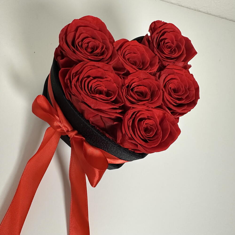 A round box filled with 7 rich, red roses — a striking and elegant arrangement that makes a bold statement. Real roses that have been carefully treated to maintain their fresh look for months or even years. These everlasting blooms are perfect for expressing timeless love, passion, and elegance. No watering or maintenance required — just lasting beauty.