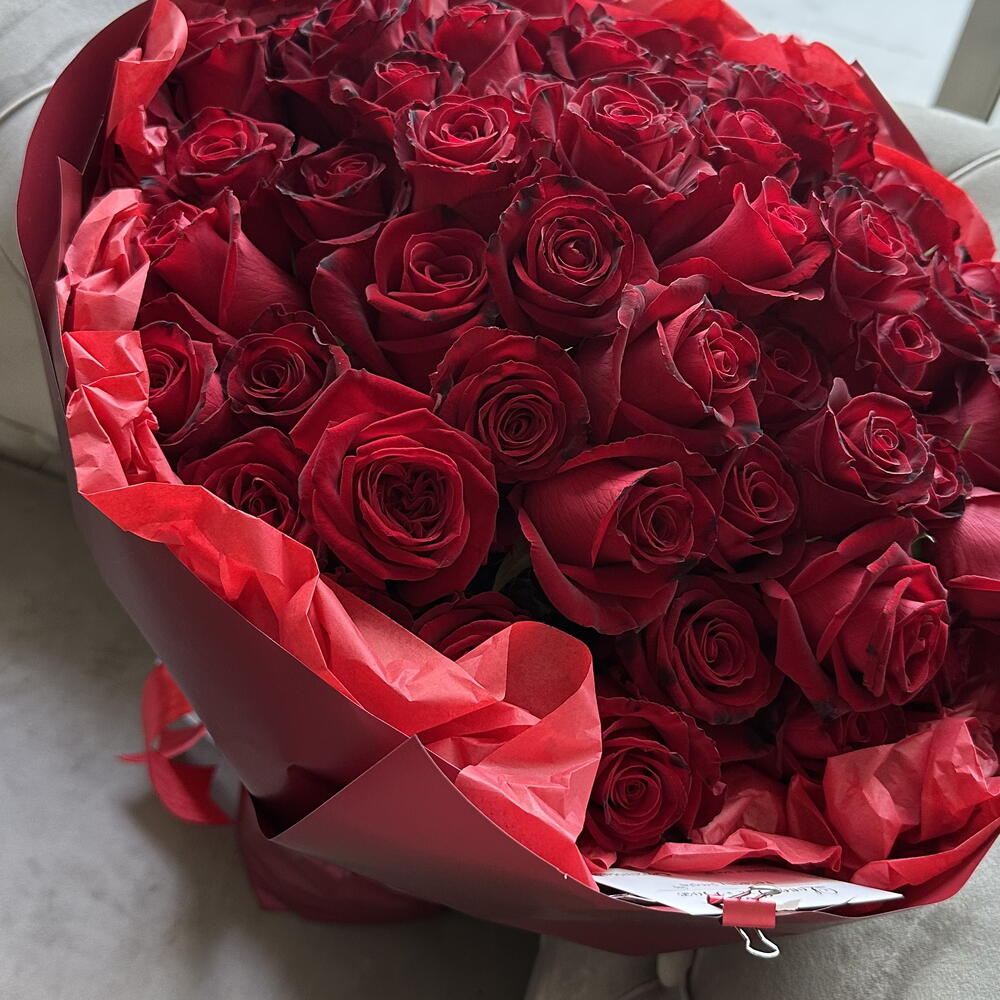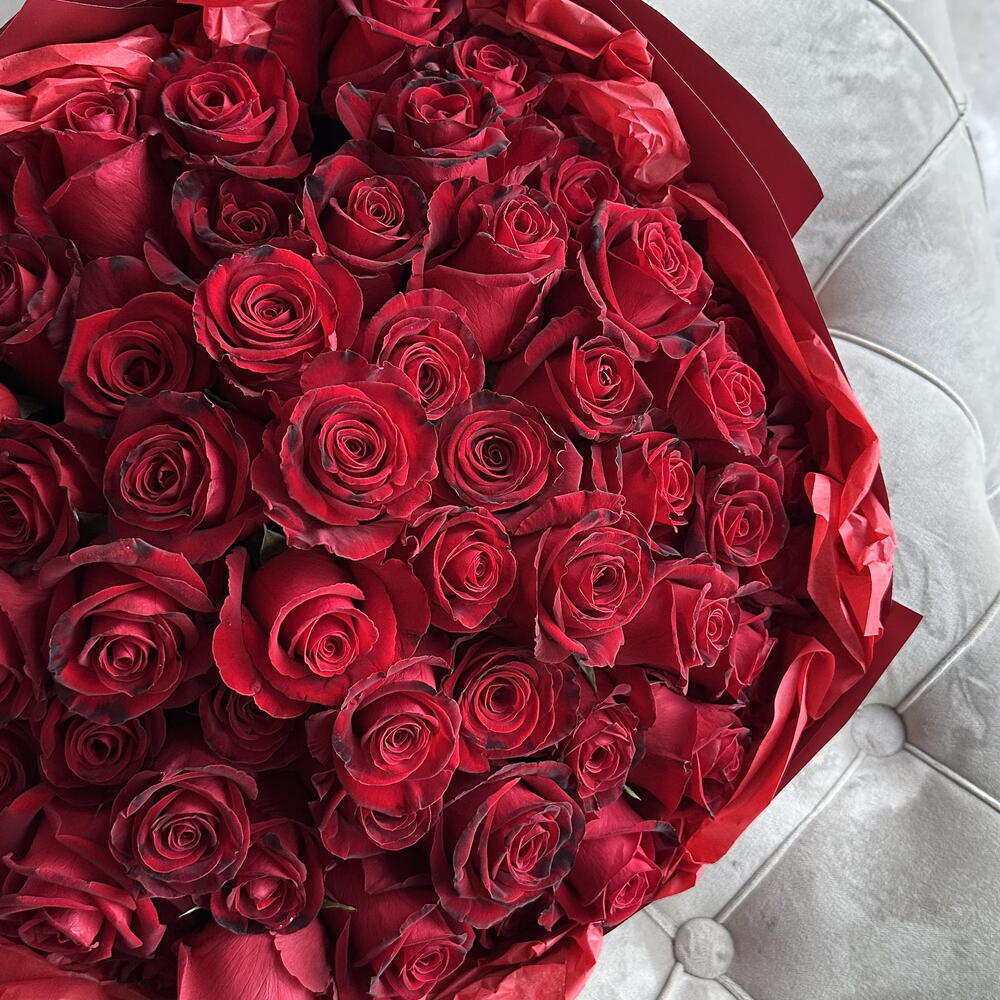 This monobucket of 60 red roses captivates with its passionate beauty and showiness. Every flower in it is a symbol of love and passion. Enter the world of exquisite taste and sophistication with this delicious bouquet in your hands. It is able to decorate the most significant events and make any ordinary day special.