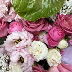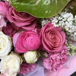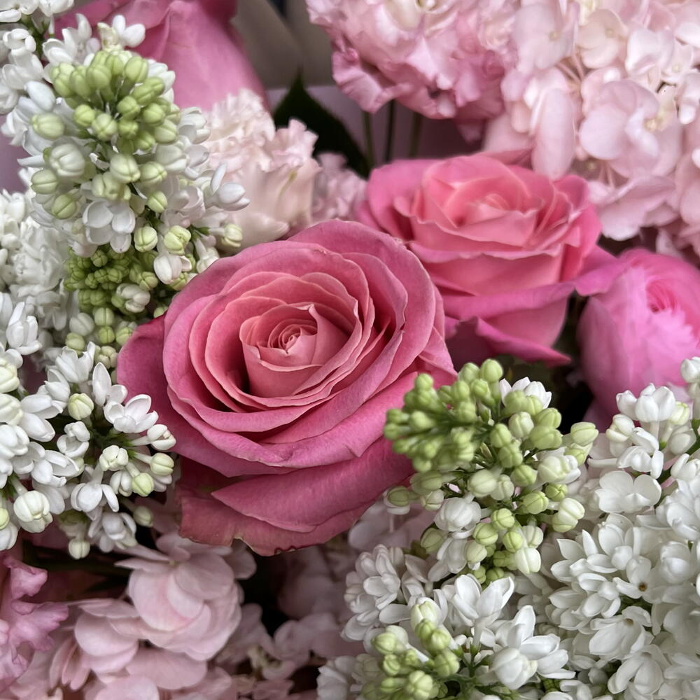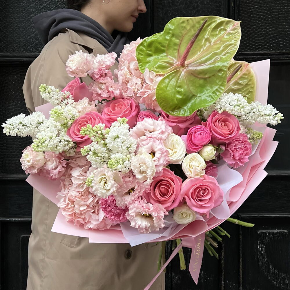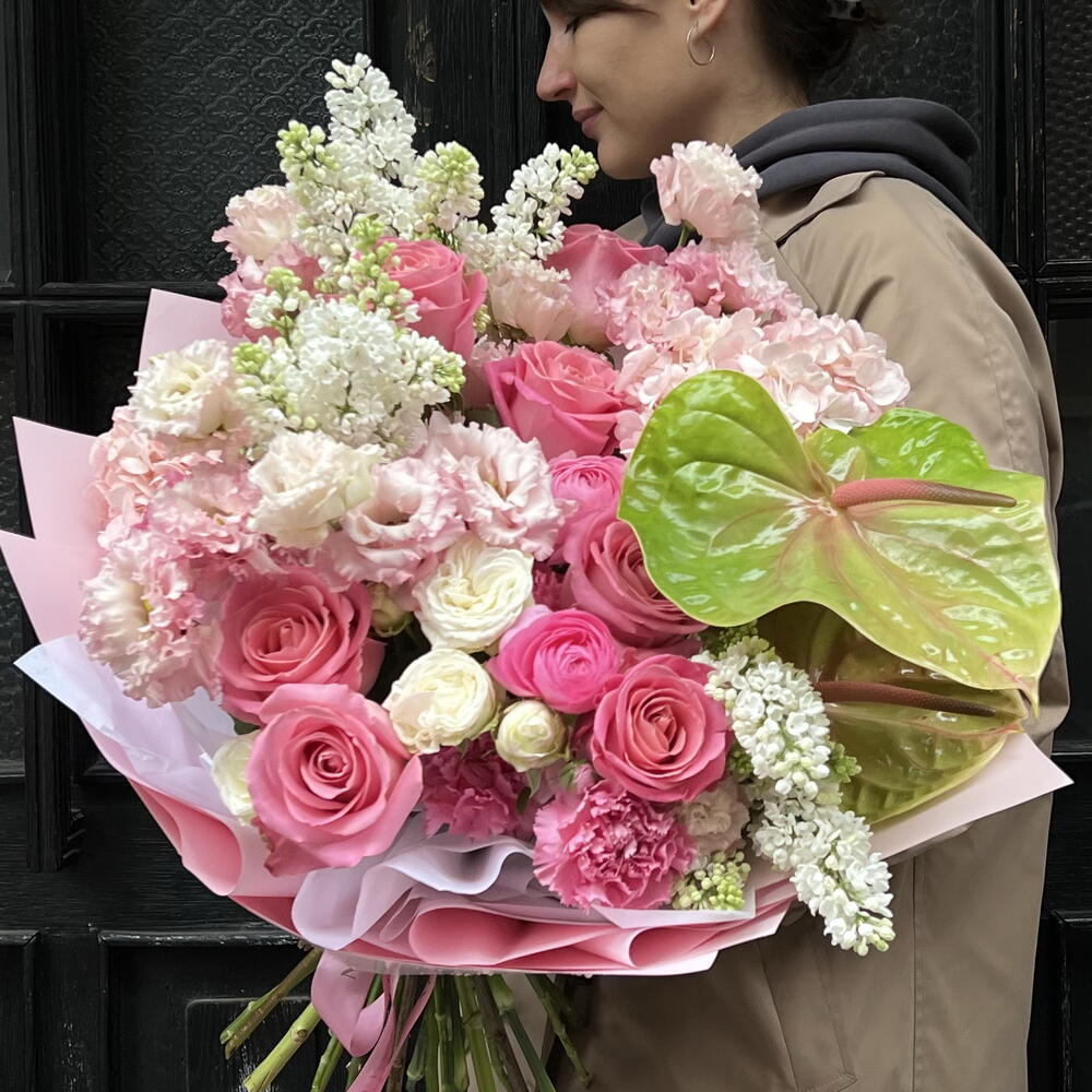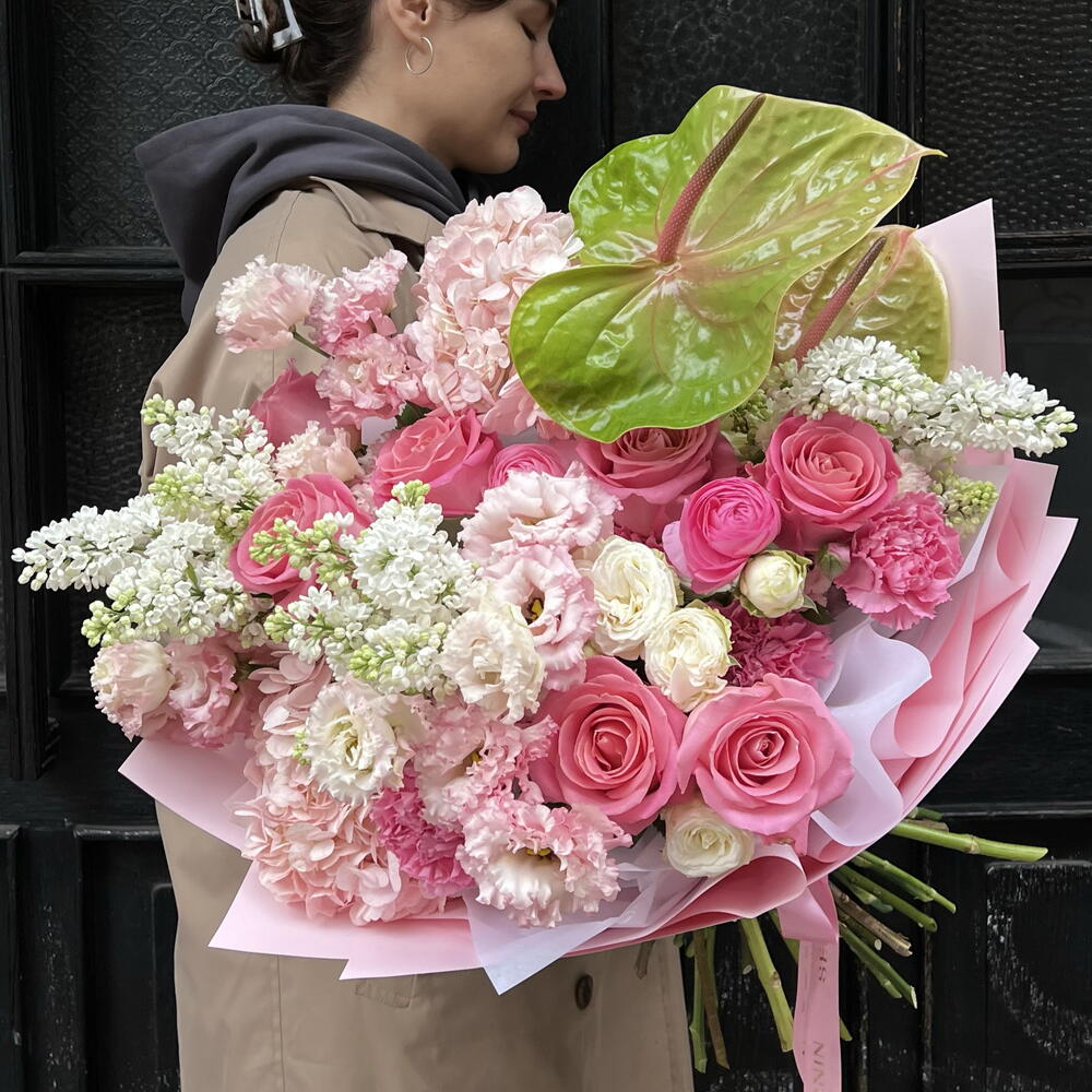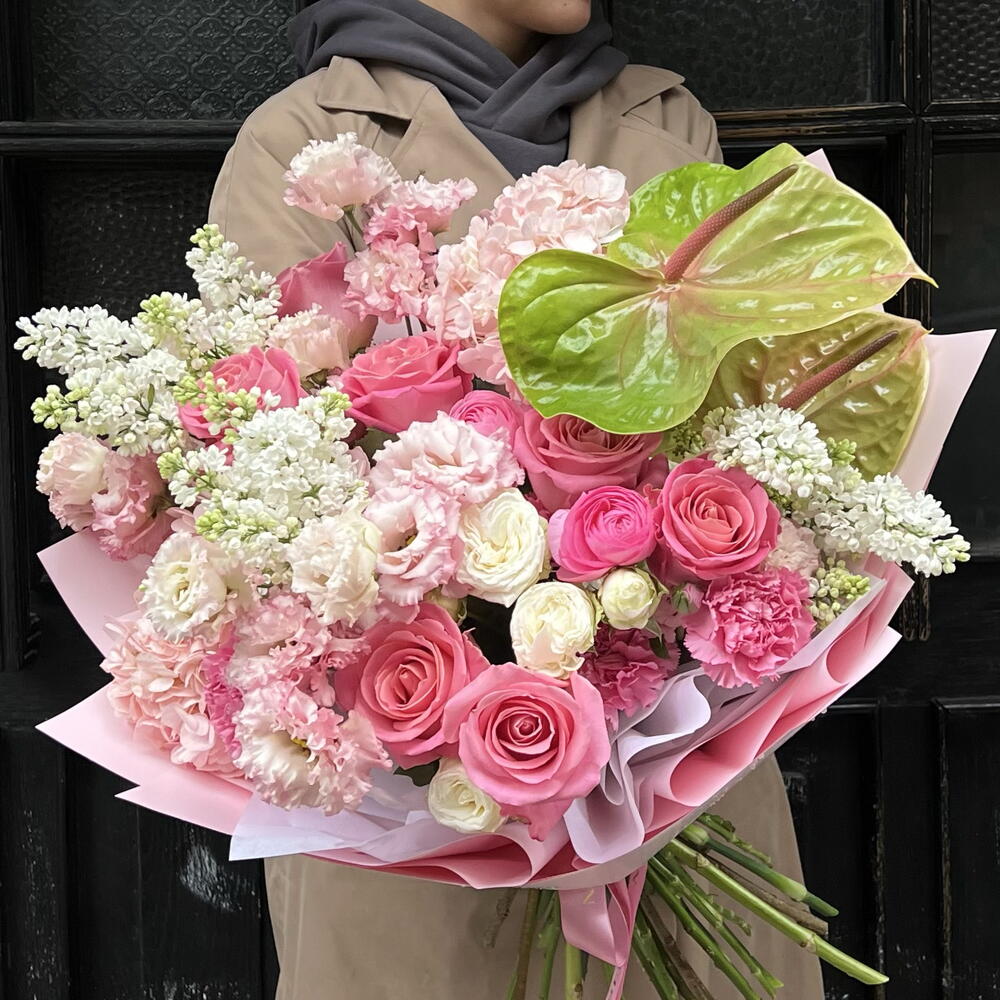 Хризантема - 1 шт. Эустома - 6 шт. Spray rose - 3 шт. hortensia - 2 шт. Anthurium - 2 шт. Lilac - 3 шт. rose - 6 шт. dianthus - 6 шт.