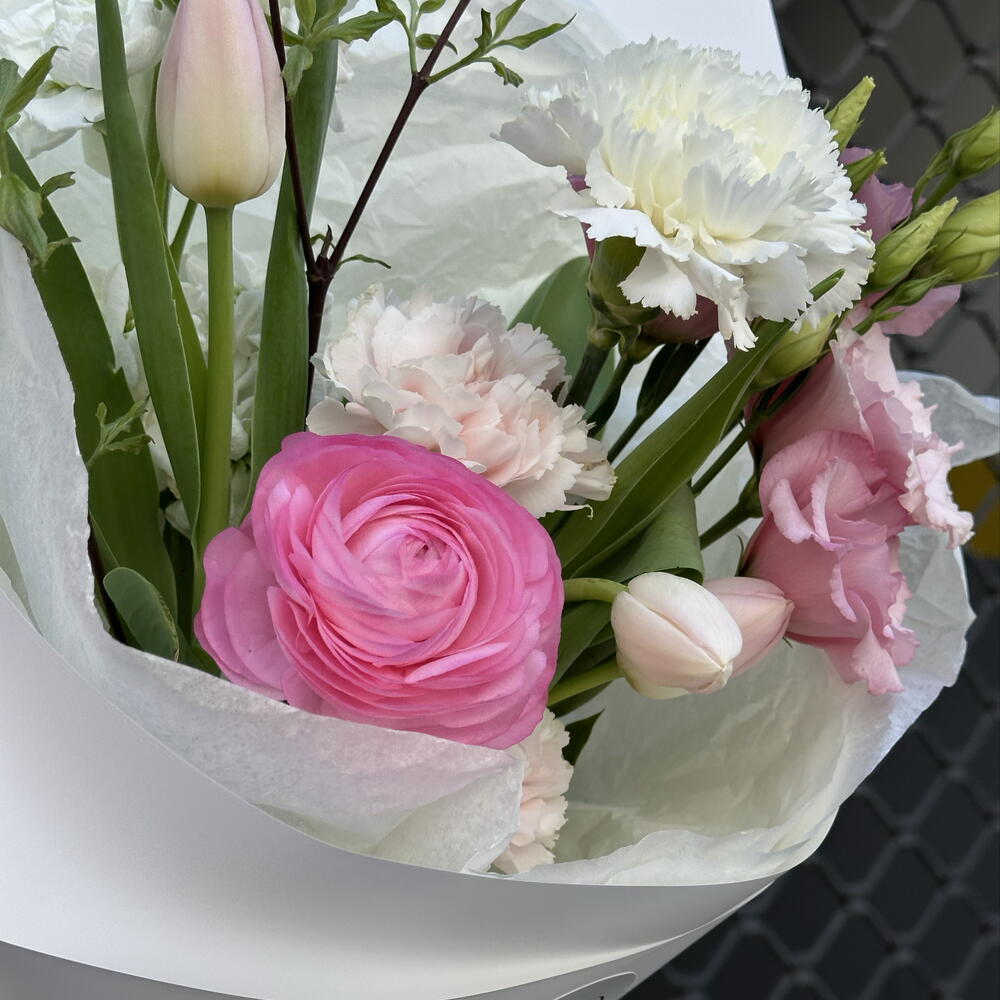 Lisianthus - 1 шт. Tulip - 3 шт. carnation - 3 шт. ranunculus - 1 шт. matthiola - 1 шт. branches - 1 шт.