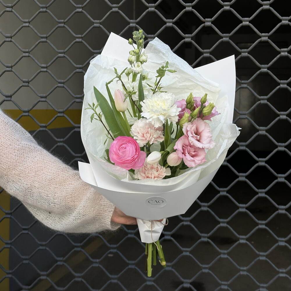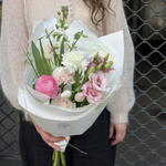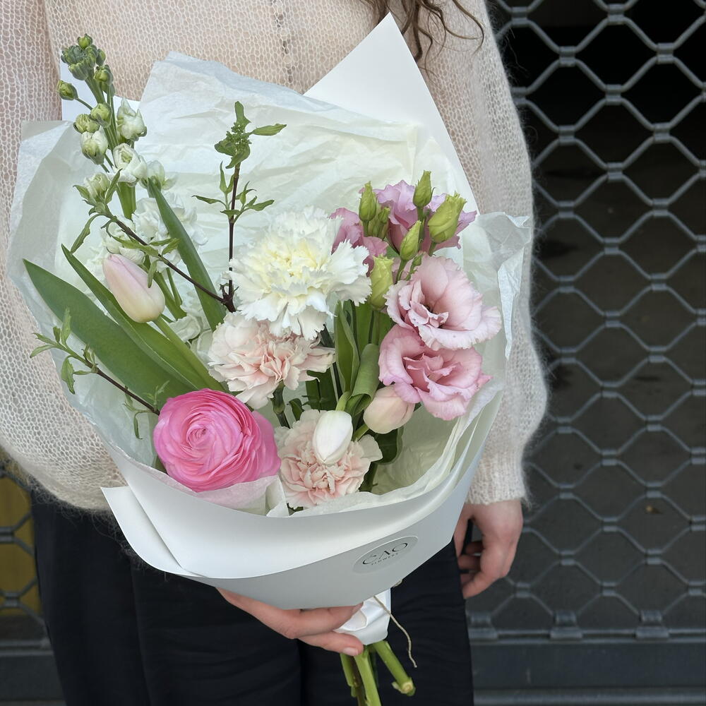 Fresh, airy, and full of light bouquet with ranunculus, Lisianthus, matthiola, carnation and tulips