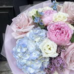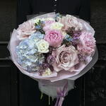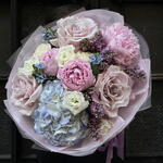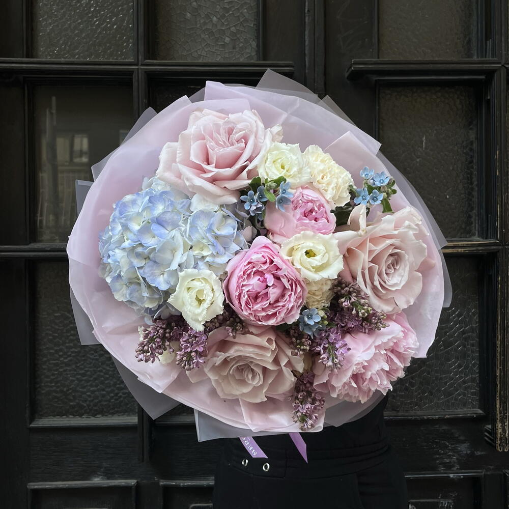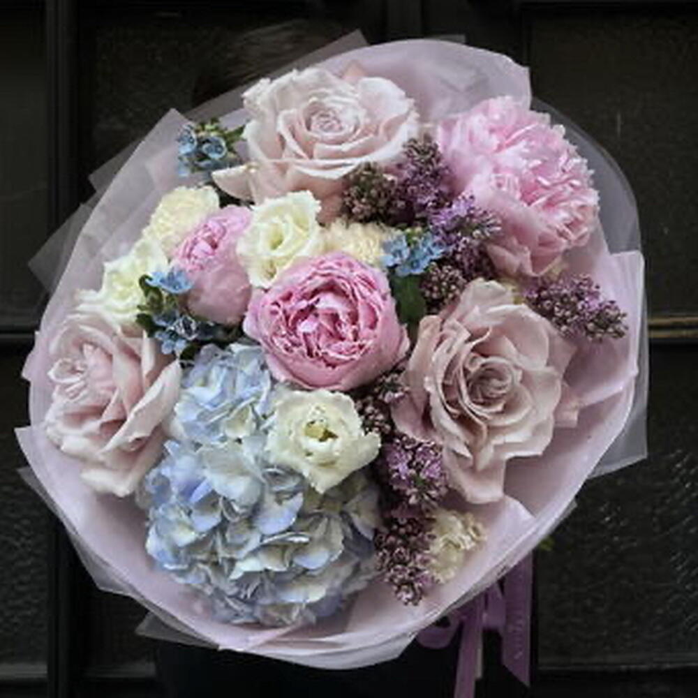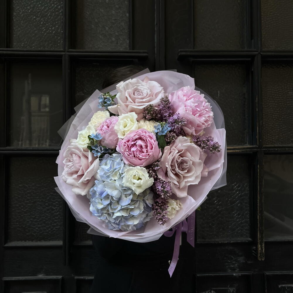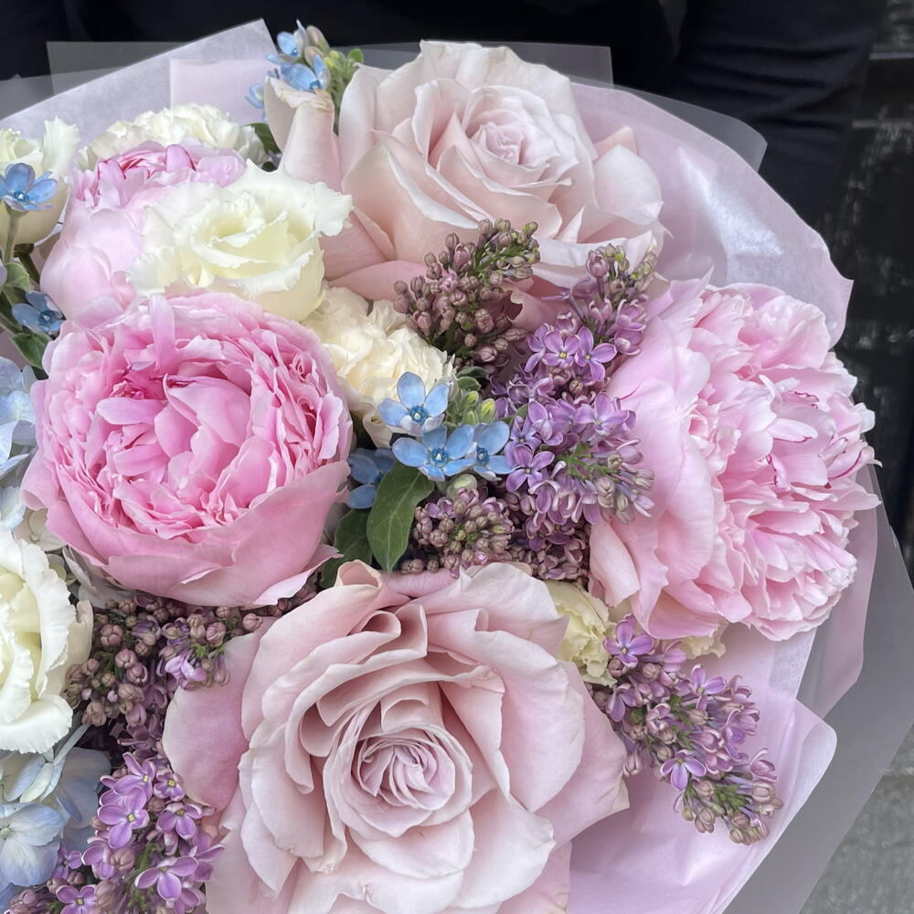 Эустома - 2 шт. Hydrangea - 1 шт. Lilac - 2 шт. rose - 3 шт. dianthus - 2 шт. oxypetalum - 3 шт. paeonia - 3 шт.
