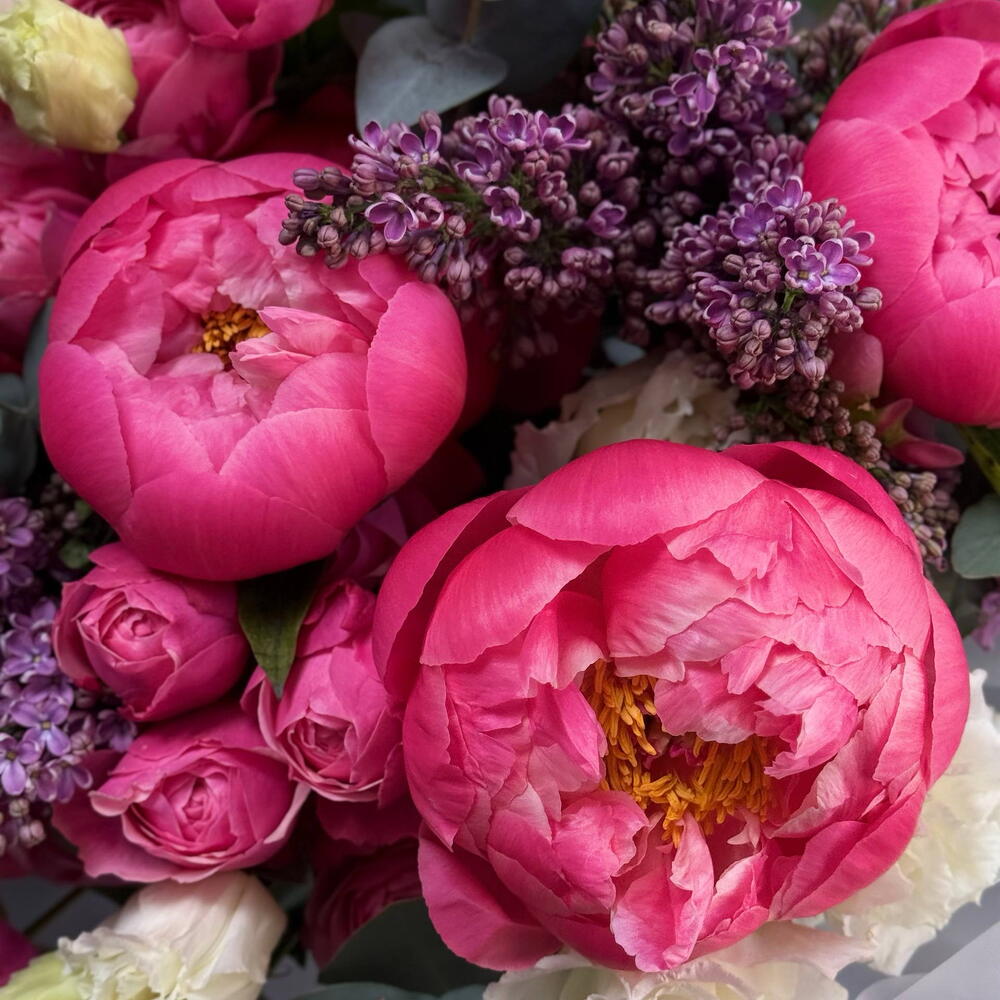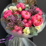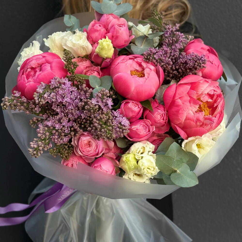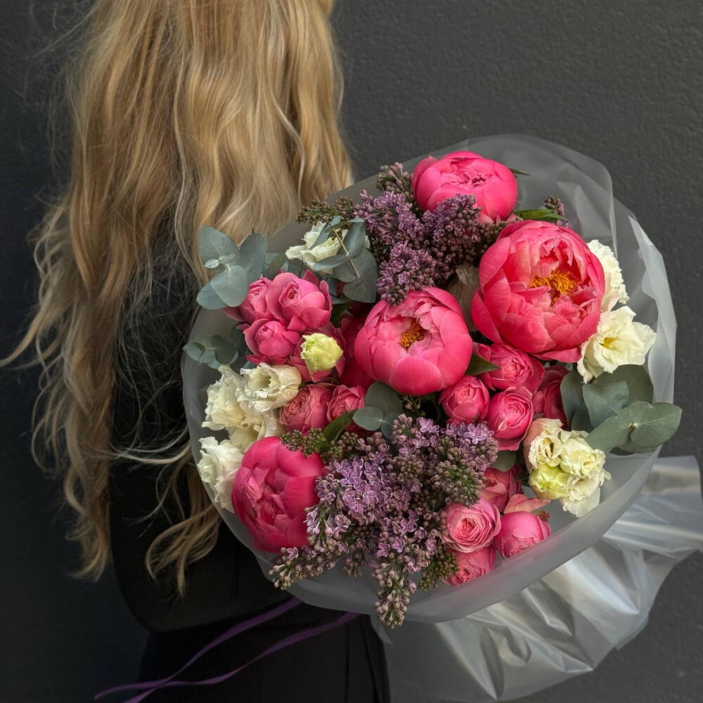 Эустома - 4 шт. Spray rose - 4 шт. Lilac - 4 шт. paeonia - 5 шт.