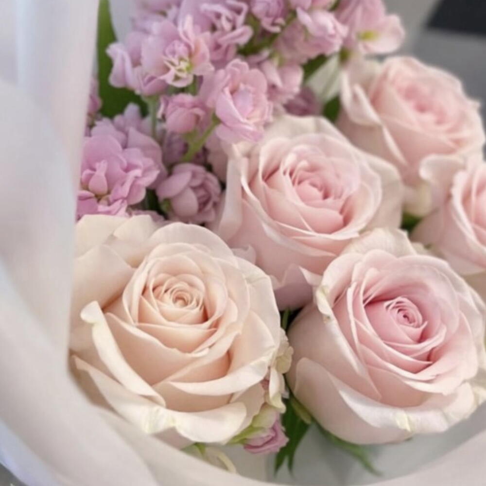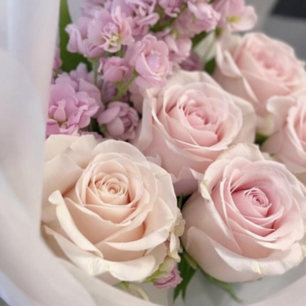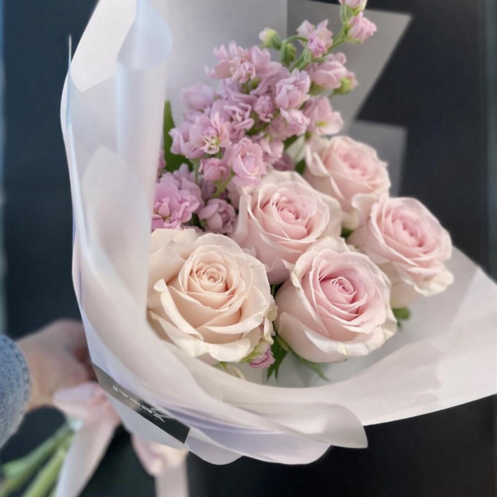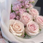 Ribbon - 2 шт. Matiola - 2 шт. paper - 4 шт. gerbera mini - 3 шт. roses - 4 шт.