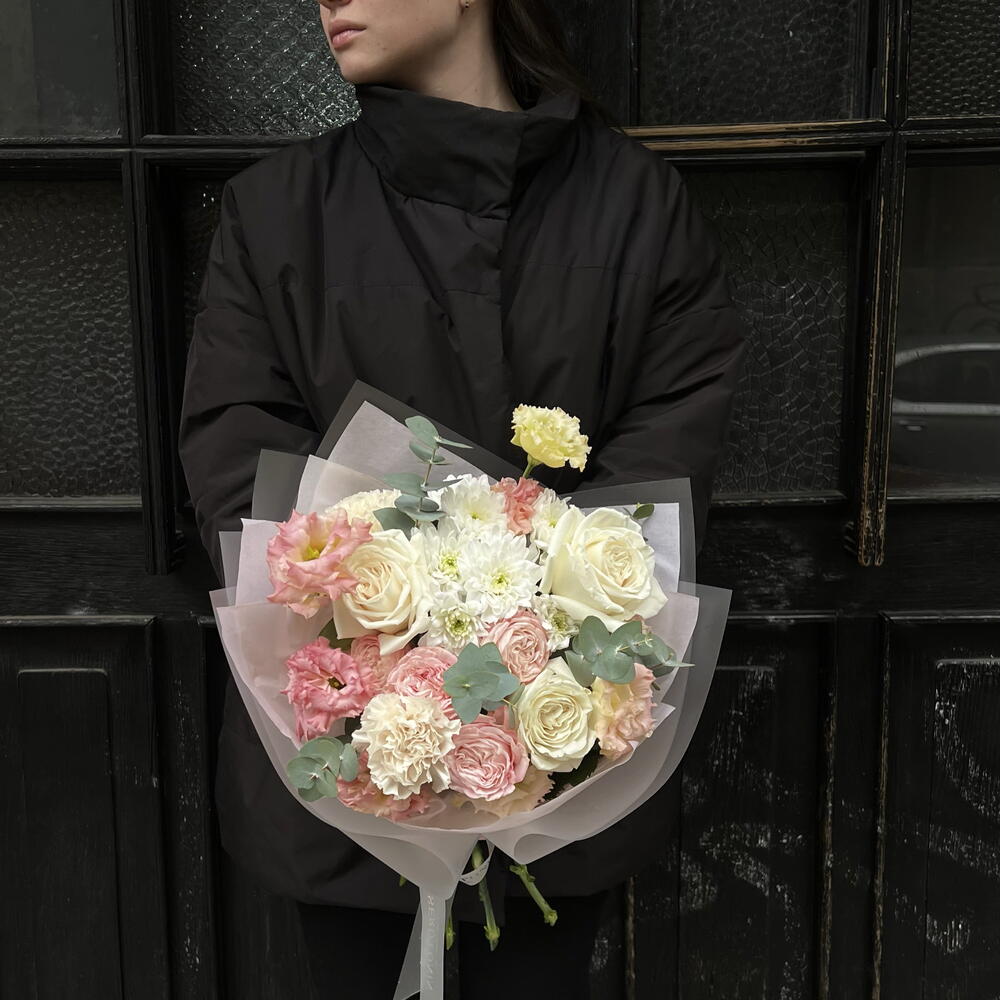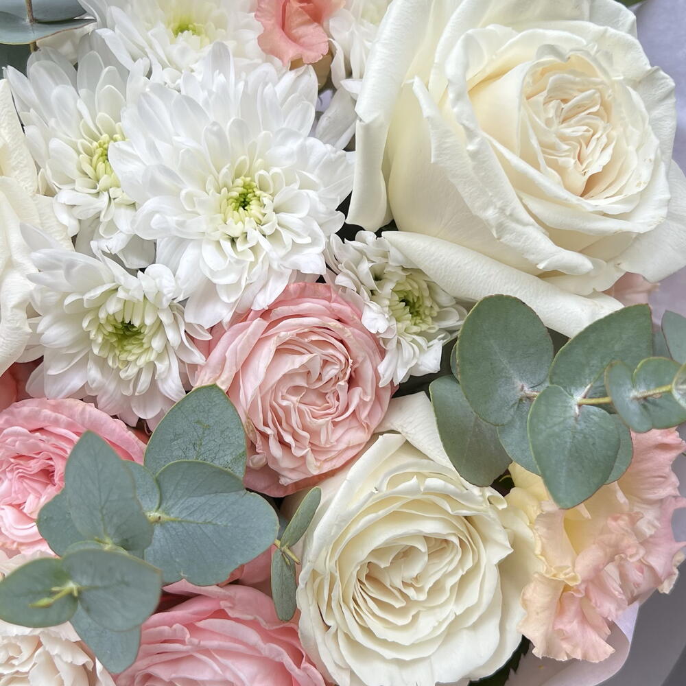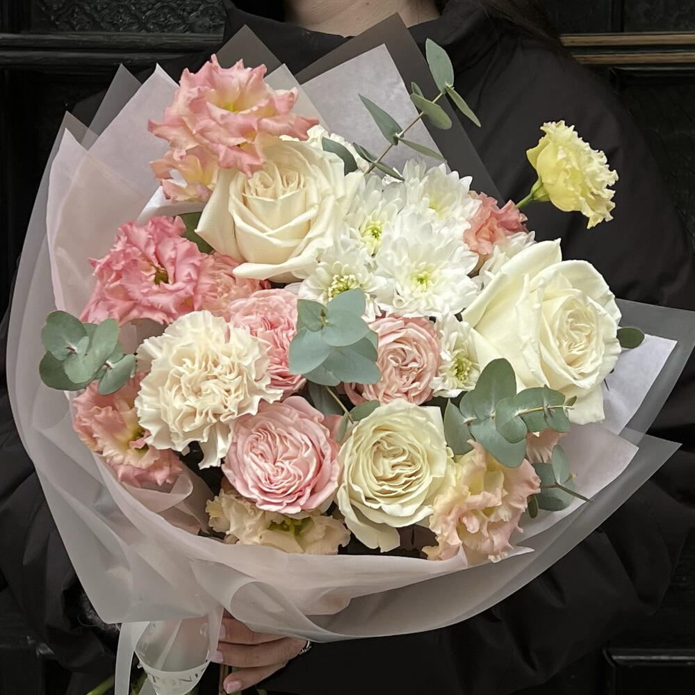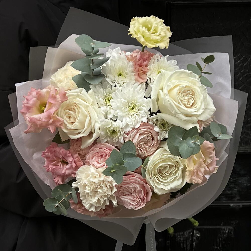 Хризантема - 1 шт. Эустома - 2 шт. Eucalyptus - 3 шт. Spray rose - 1 шт. rose - 3 шт. dianthus - 2 шт.