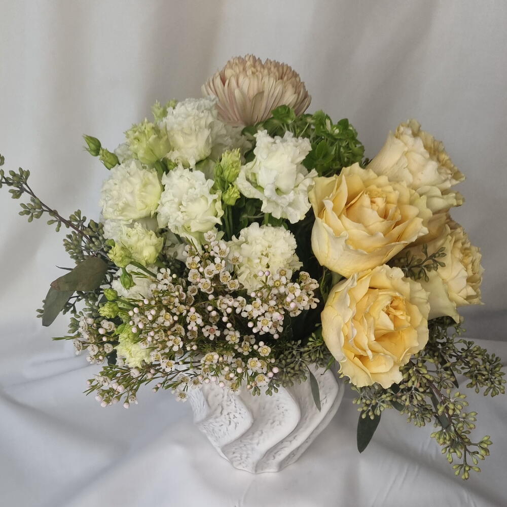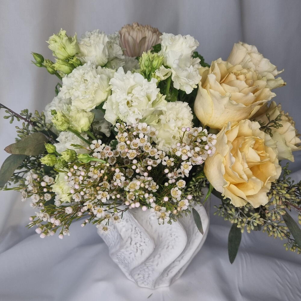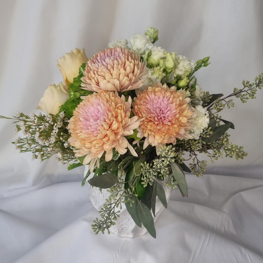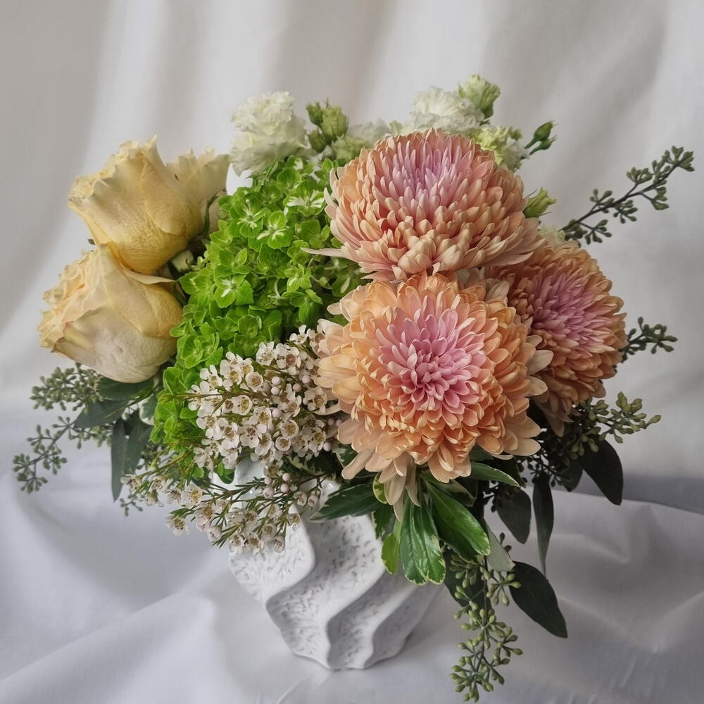 Очаровательная цветочная композиция в теплых персиковых и нежных розовых тонах, выполненная в скульптурной керамической вазе. Садовые розы в сочетании с фактурными хризантемами, свежей зеленью и нежными сезонными акцентами создают уютную, но изысканную композицию. Идеально подходит для дней рождения, подарков в знак благодарности, новоселья или просто для того, чтобы поднять кому-то настроение. Каждая композиция изготовлена вручную и может немного отличаться в зависимости от сезонной доступности, сохраняя при этом свою цветовую палитру, стиль и общую ценность. ✔️ В керамической вазе ✔️ Свежие цветы премиум-класса ✔️ Нежная, теплая цветовая палитра ✔️ Идеально подходит для повседневных подарков и украшения дома