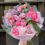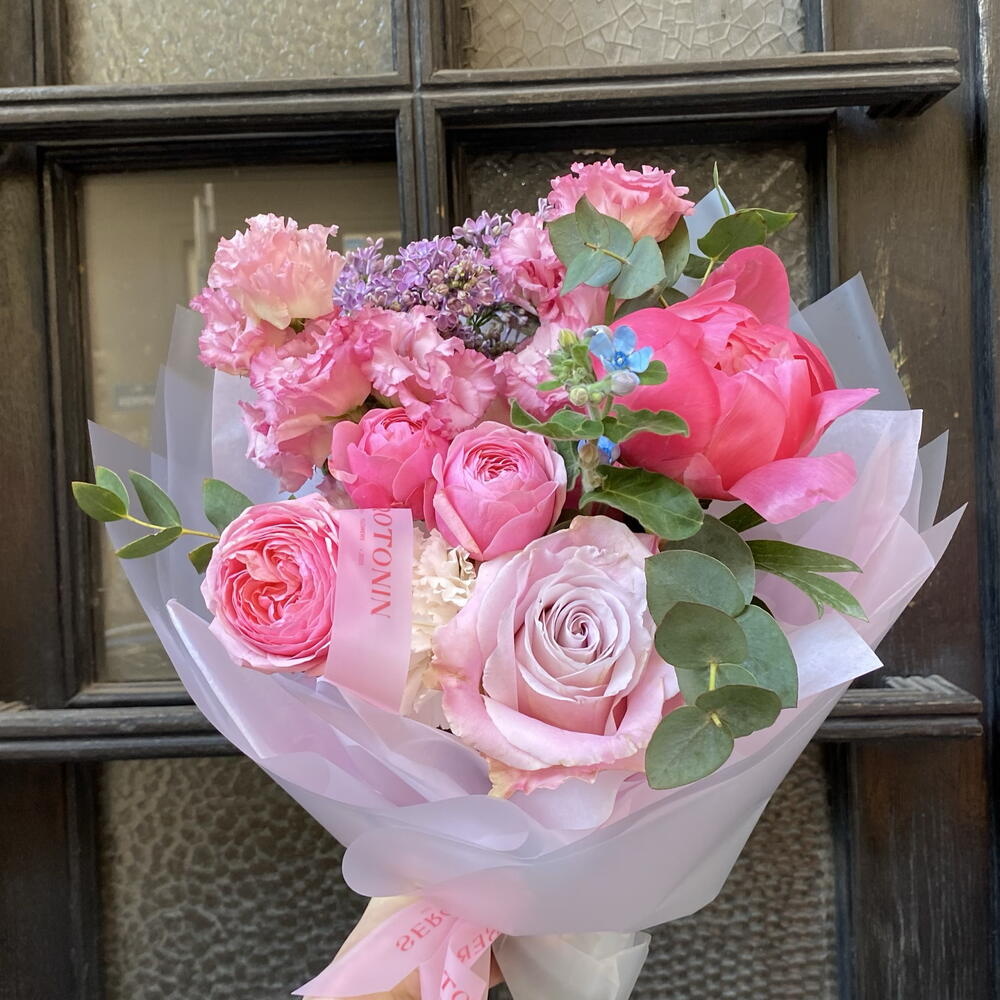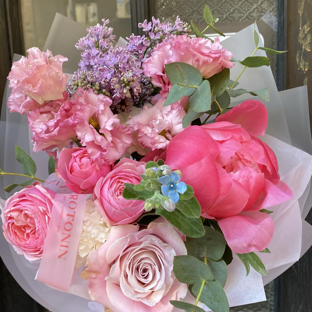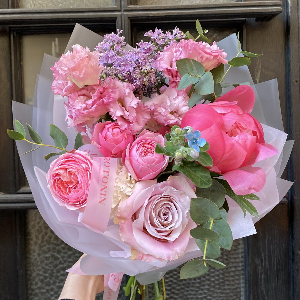 Эустома - 2 шт. Spray rose - 1 шт. Peony - 1 шт. Lilac - 1 шт. rose - 1 шт. dianthus - 2 шт. eucalipto - 1 шт. oxypetalum - 1 шт.