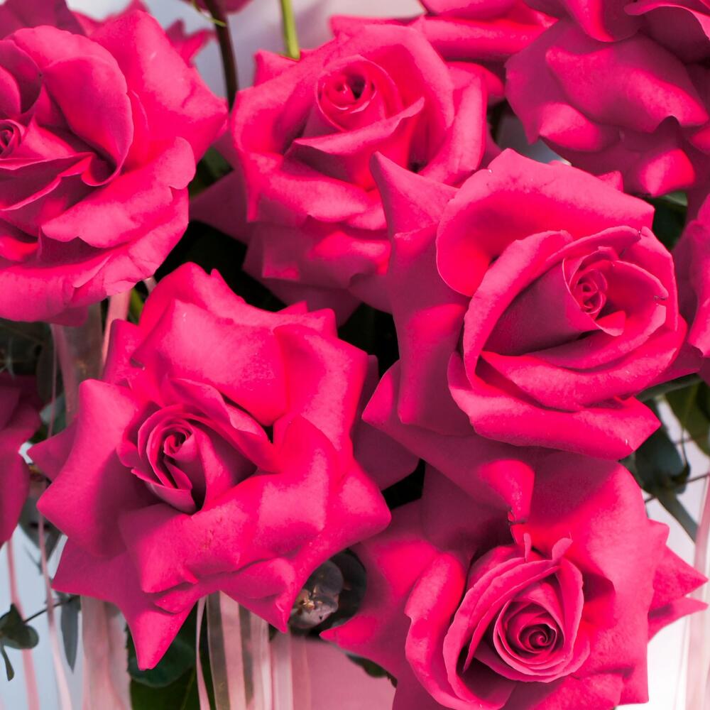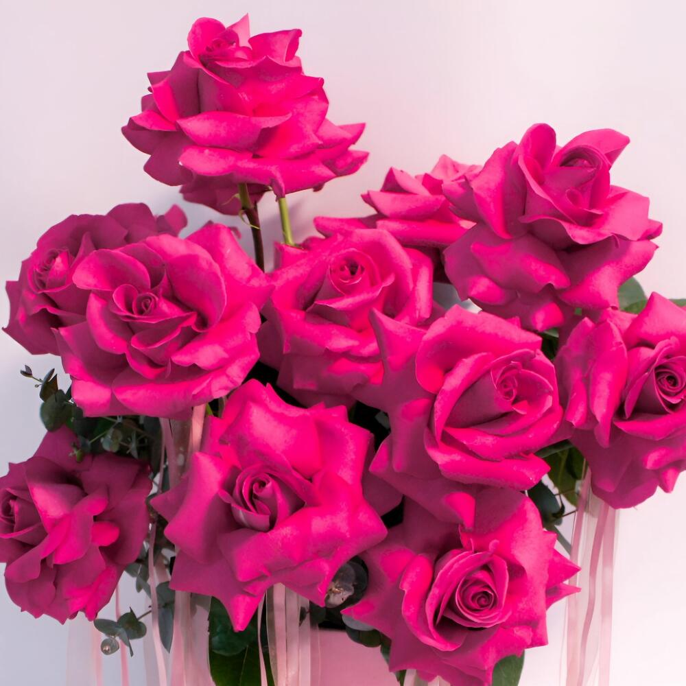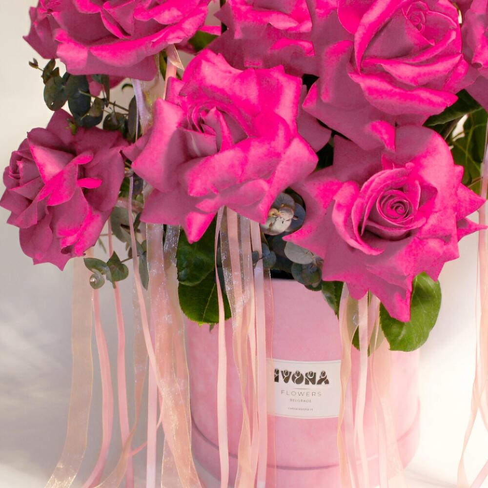 Pink box filled with 15 fresh pink roses and eucalyptus.