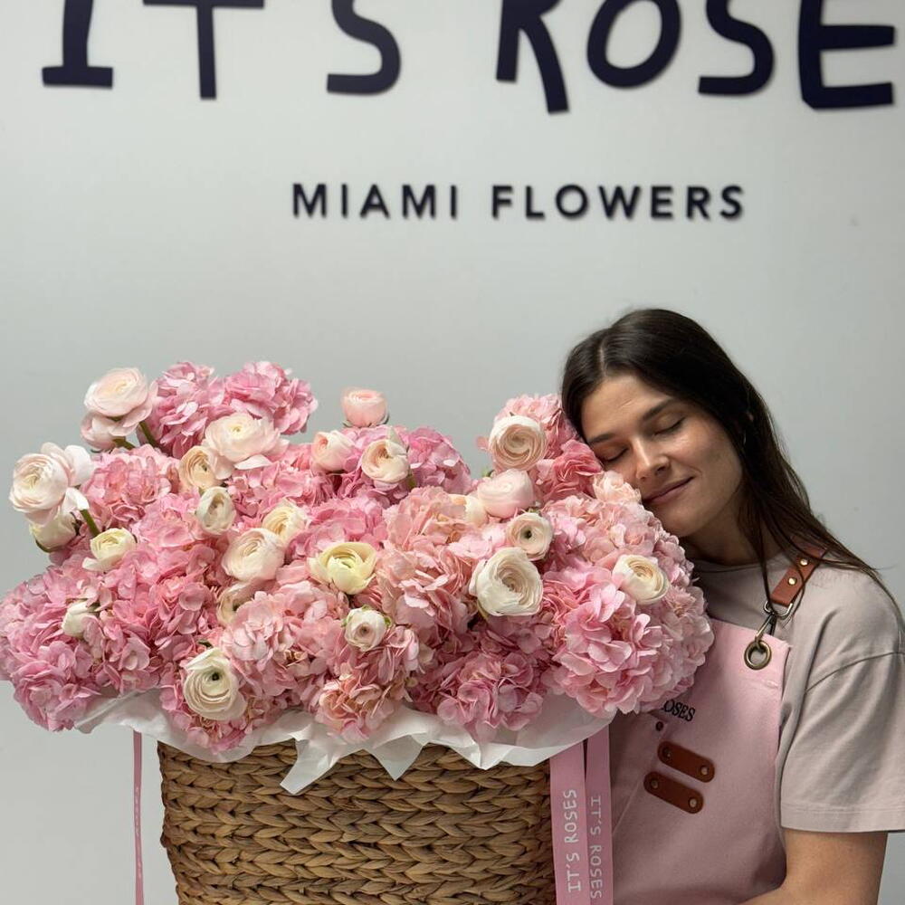 Basket - 1 шт. hydrangea pink - 13 шт. ranunculus - 10 шт.