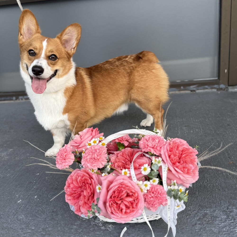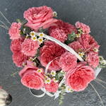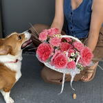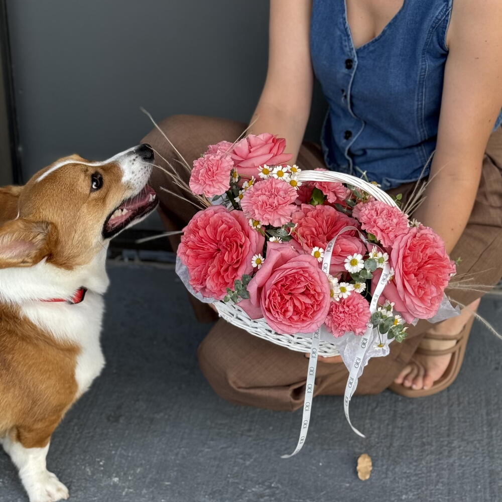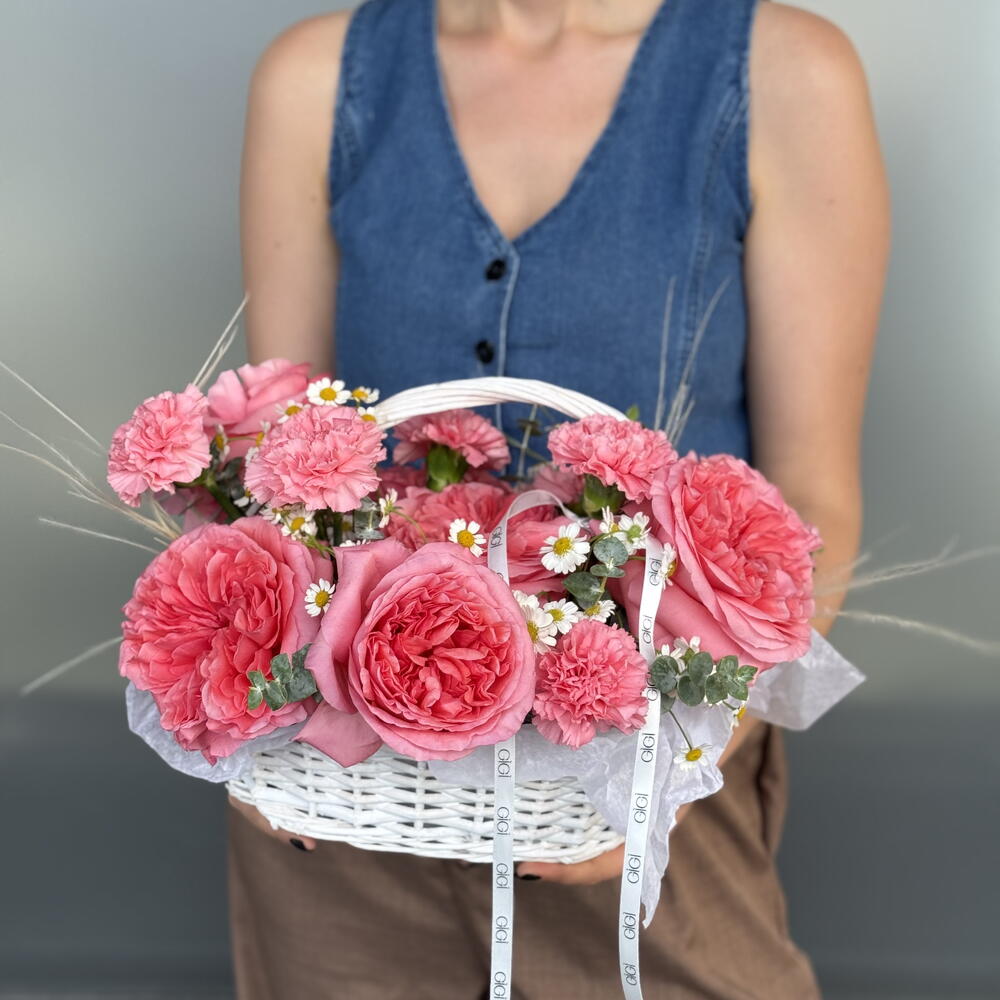 Eucalyptus - 8 шт. chamomile - 2 шт. carnations pink - 8 шт. pink expression garden rose - 7 шт.