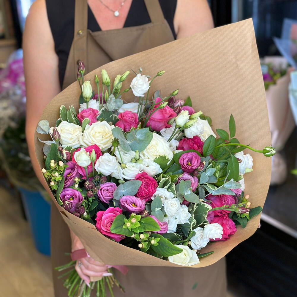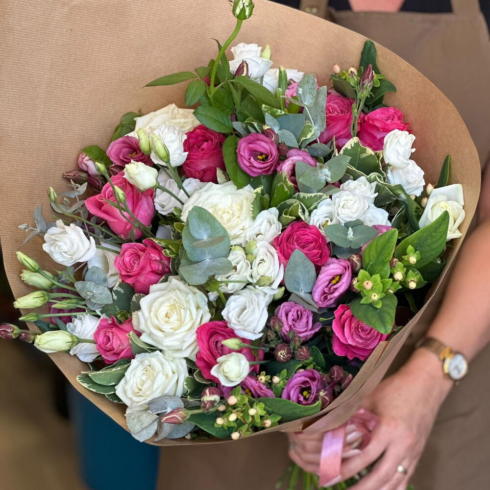Pink rose - 7 шт. White rose - 5 шт. lisianthus white - 5 шт. lisianthus pink - 5 шт. efkali̇pt - 10 шт.