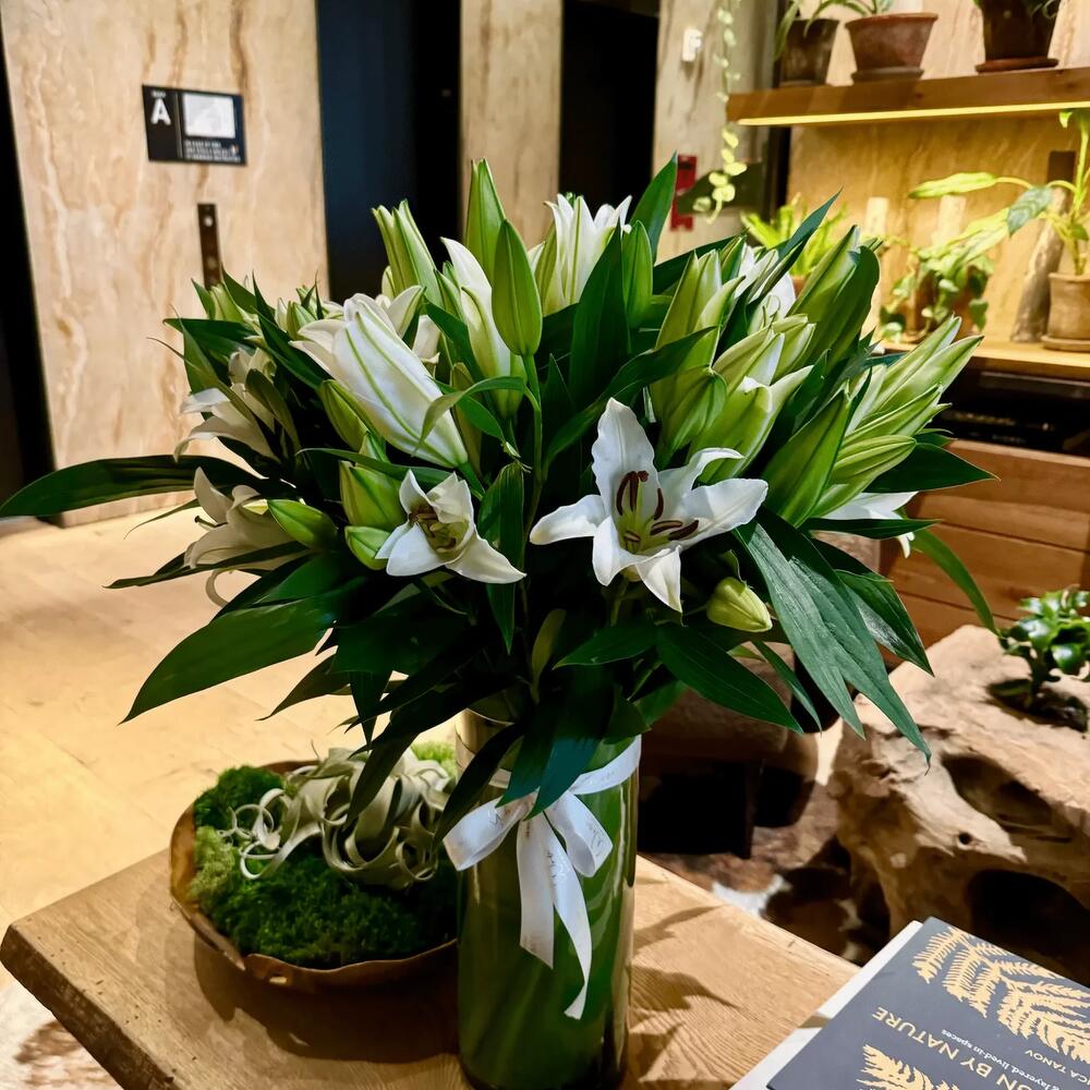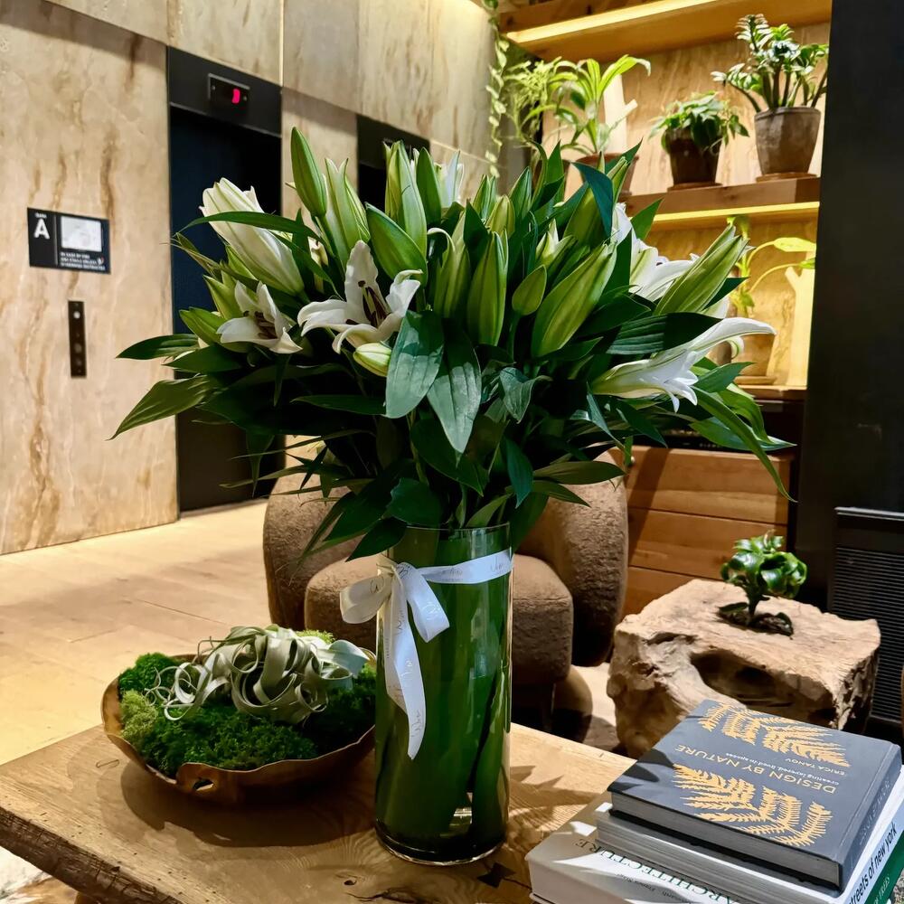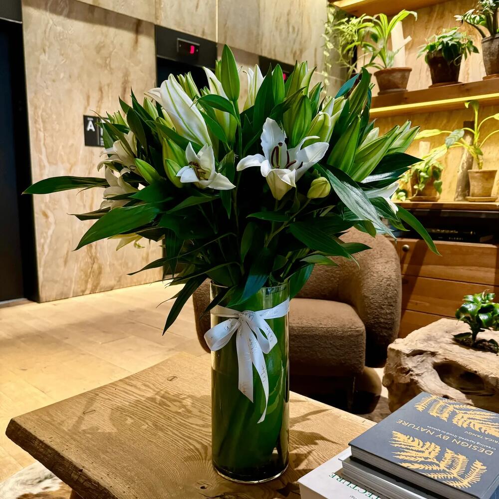 Introducing the Pure Lily Elegance, a stunning bouquet of fresh lilies elegantly presented in a stylish vase. What’s inside: Approx. 15 stems of Elegant White Lilies