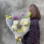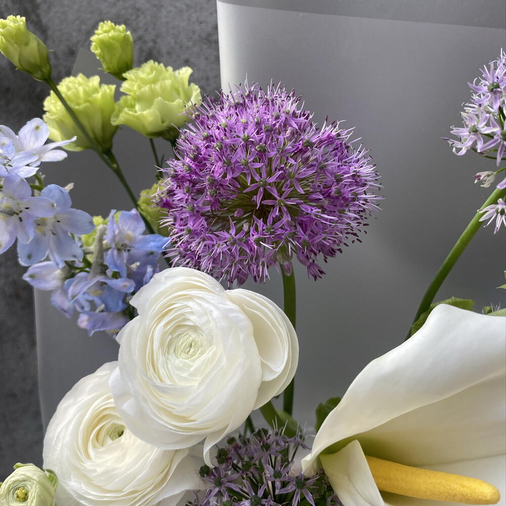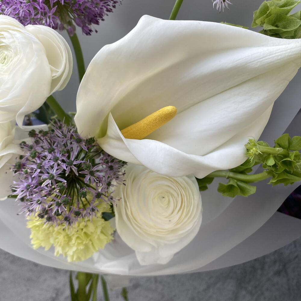 Калла - 1 шт. Эустома - 1 шт. Ribbon - 1 шт. packaging - 3 шт. dianthus - 1 шт. ranunculus - 3 шт. delphinium - 1 шт. allium - 4 шт. moluccella - 2 шт.