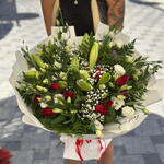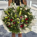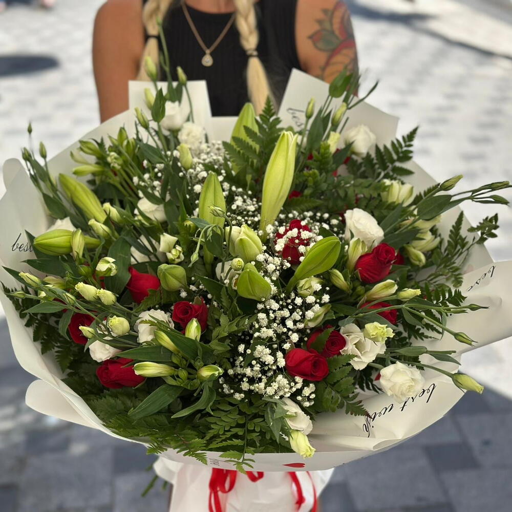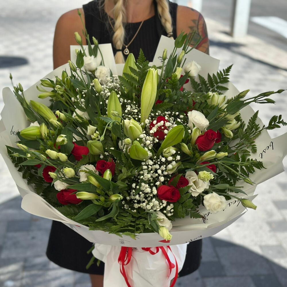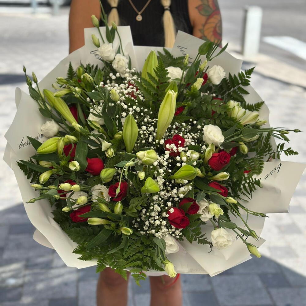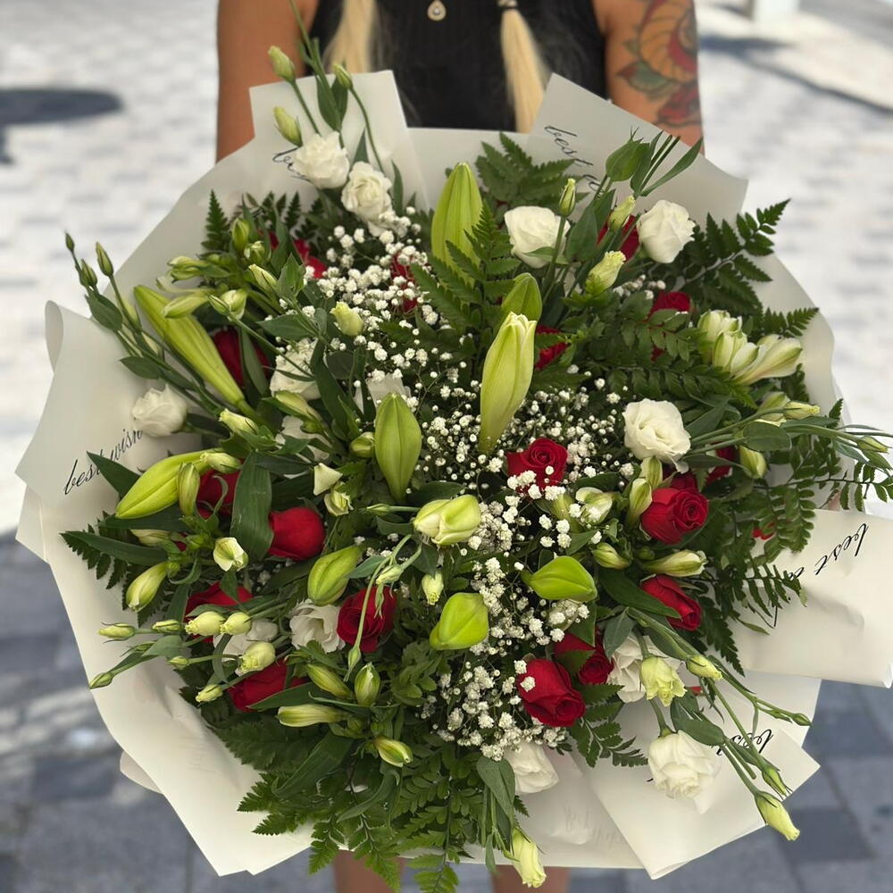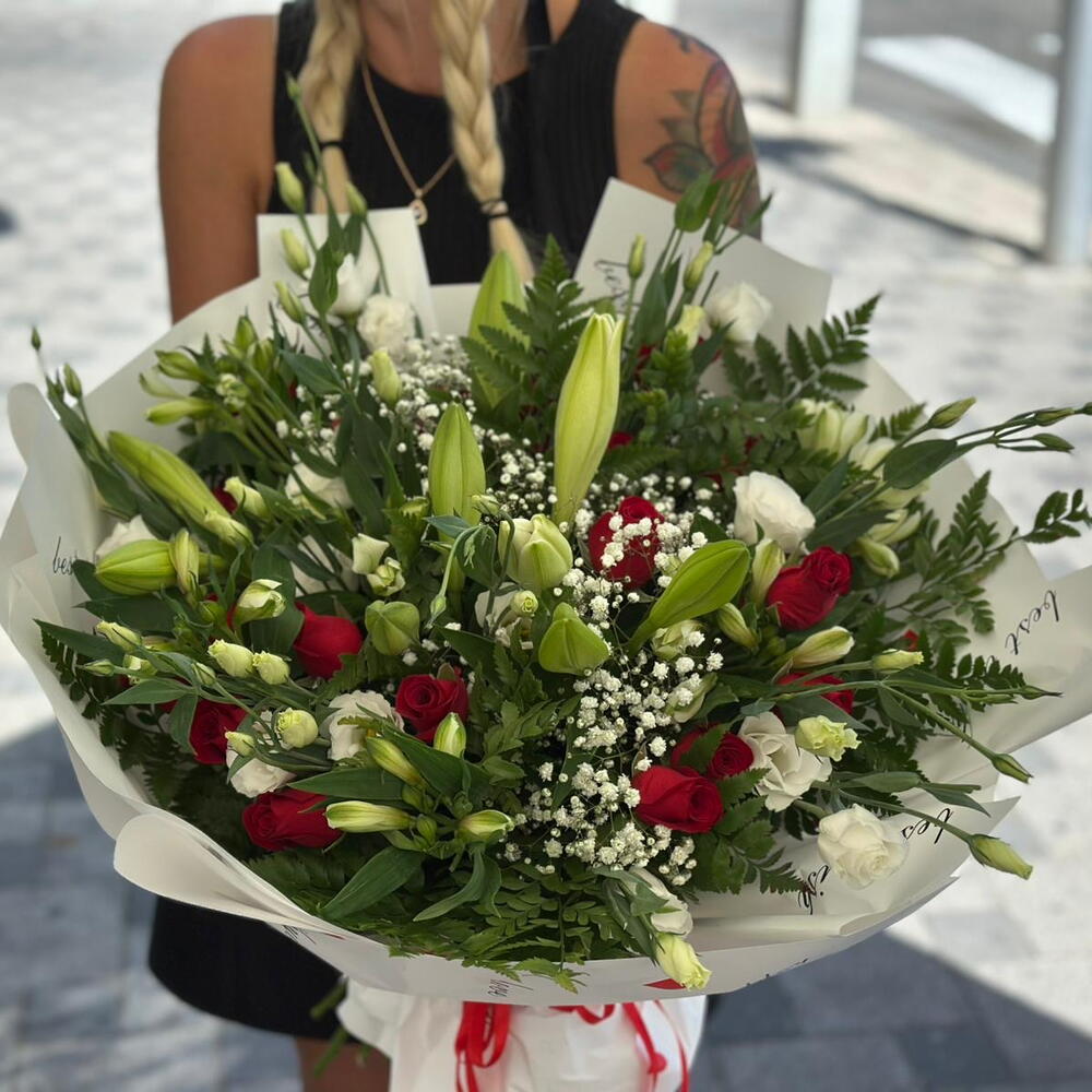 Red rose - 11 шт. White lilies - 7 шт. white lisianthus - 7 шт. eukalyptus - 10 шт. gibsafila - 5 шт.