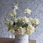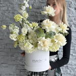 Принесите глоток свежей элегантности в любую комнату с этим потрясающим бело-зелёным букетом — чистая радость в коробке! В составе безупречные белые французские розы, пышные зелёные гвоздики, нежные белые эустомы и пышные гортензии, эта красота мгновенно поднимает настроение каждому, кому посчастливится её получить. Идеально подходит, чтобы дарить улыбки и добавить тот самый изысканный акцент цвета, которого так не хватало вашему пространству!