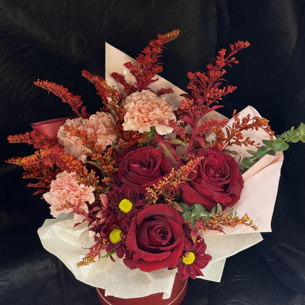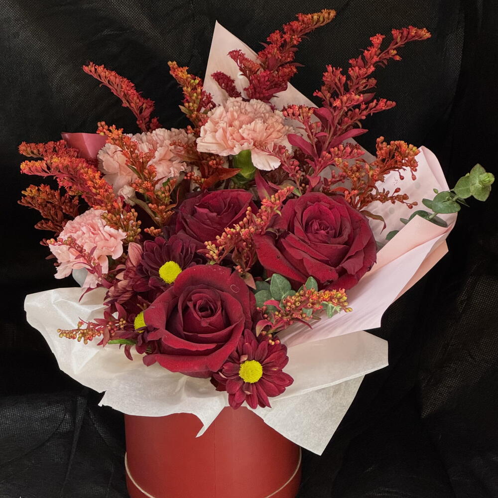 Box - 1 шт. Chrysanthemum - 1 шт. carnation - 3 шт. wrapping paper - 3 шт. soledago - 2 шт. roses - 3 шт.