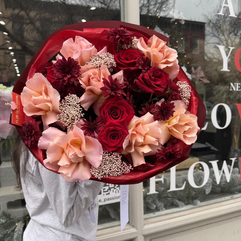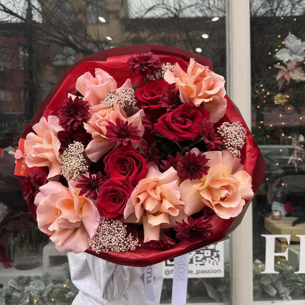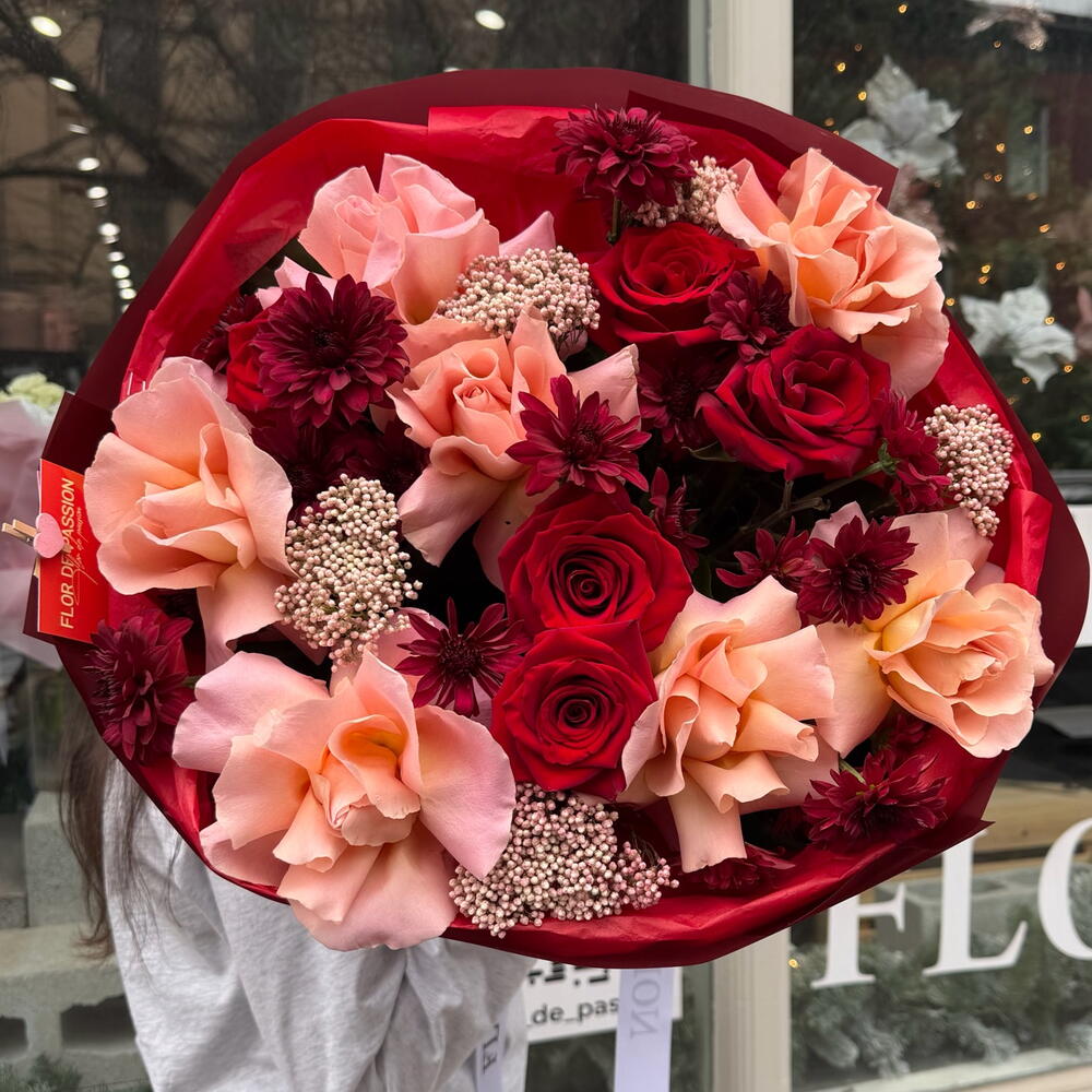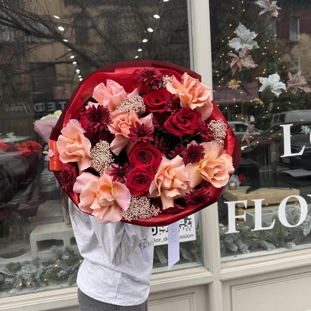 Произведите смелое впечатление с нашим букетом Red Statement, изысканным сочетанием вечной элегантности французских роз, деликатной текстуры рисового цветка, ярких роз Explorer и эффектных красных ромашек. Эта искусно подобранная композиция балансирует классический романтизм с современным шиком, создавая выразительный фокус в любом пространстве. Идеально подходит для выражения страсти, празднования важных событий или привлечения внимания на особых мероприятиях, этот букет производит сильное визуальное впечатление благодаря продуманной гармонии цветов и разнообразию фактур цветков, которые обеспечивают долговечную красоту и визуальную привлекательность.
