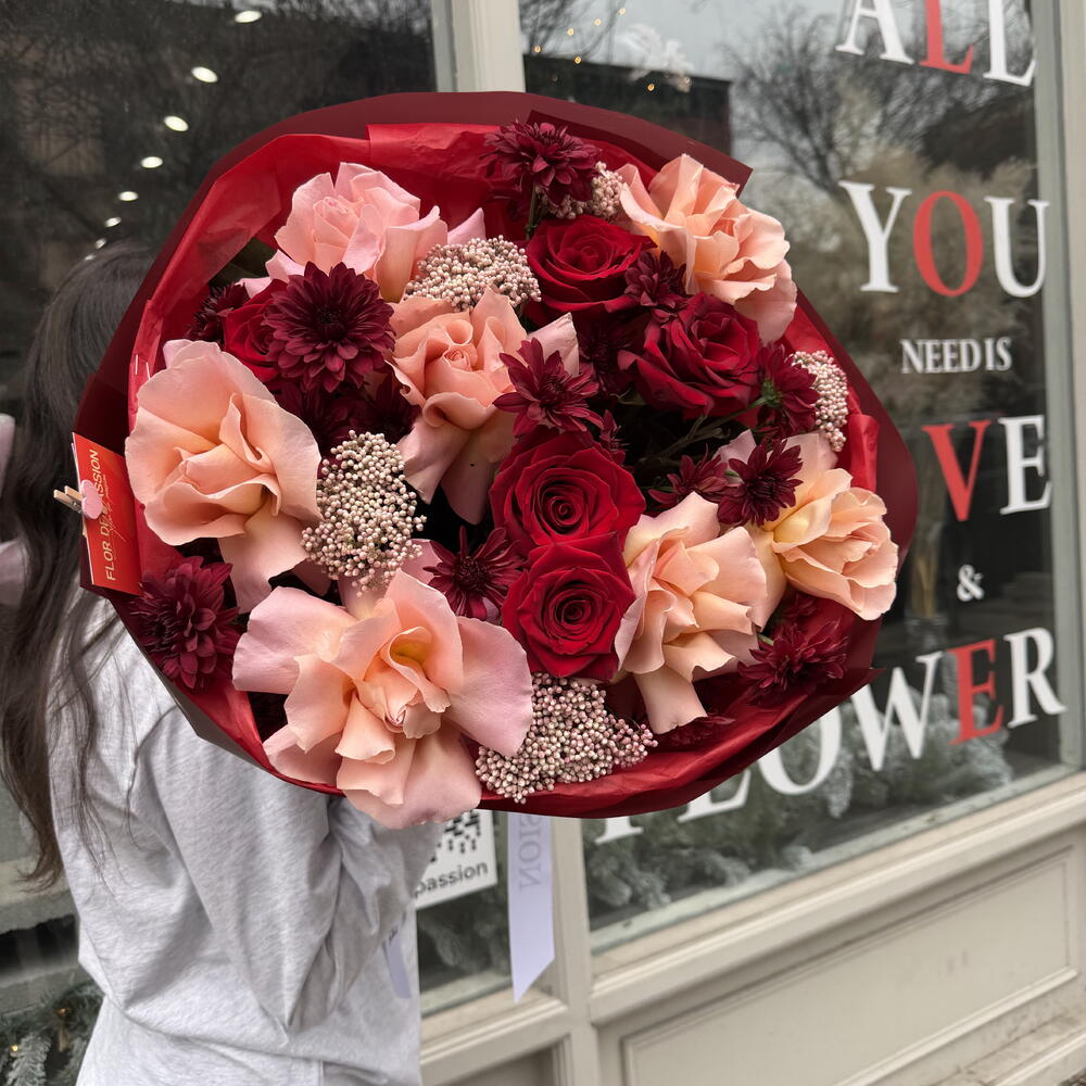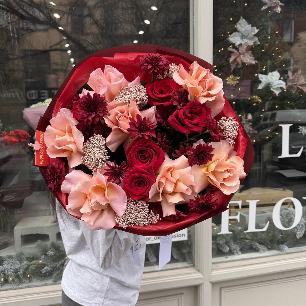 Букет "Red Statement", размер M (французские розы, Explorer Rosed, рисовый цветок, красная ромашка)