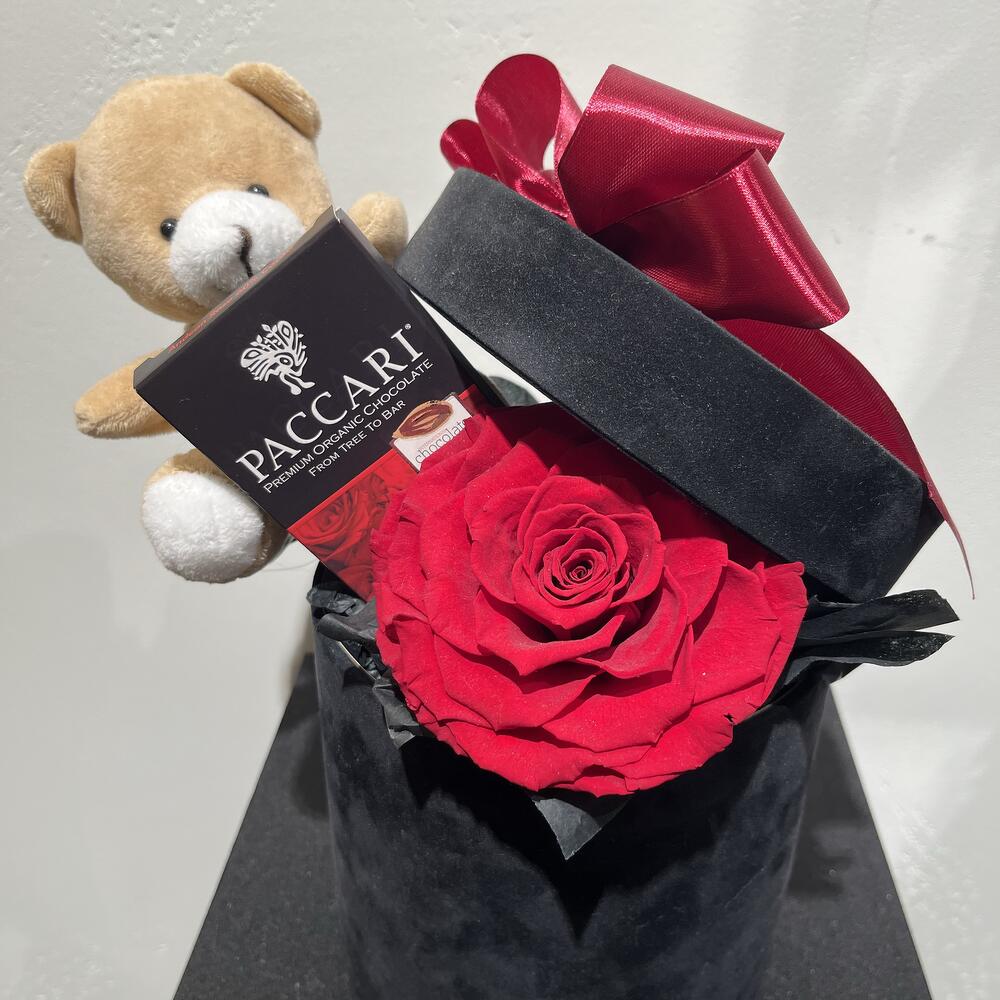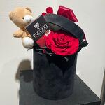 Box - 1 шт. Bear - 1 шт. Chocolate - 1 шт. paper - 1 шт. preserved rose - 1 шт. ribbon satin - 1 шт.